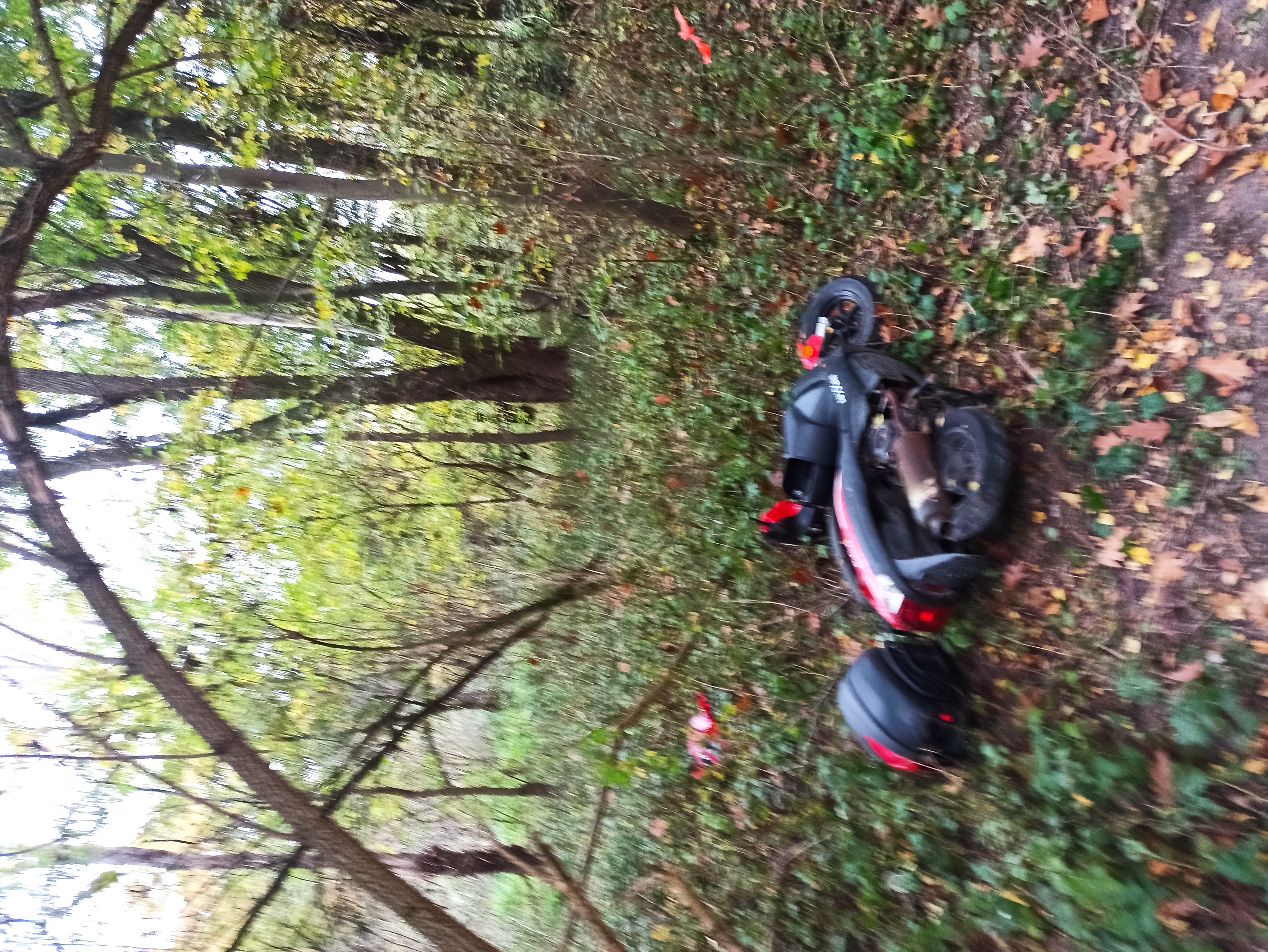 Neben dem Weg liegt ein kaputter Motorroller ohne Kennzeichen
