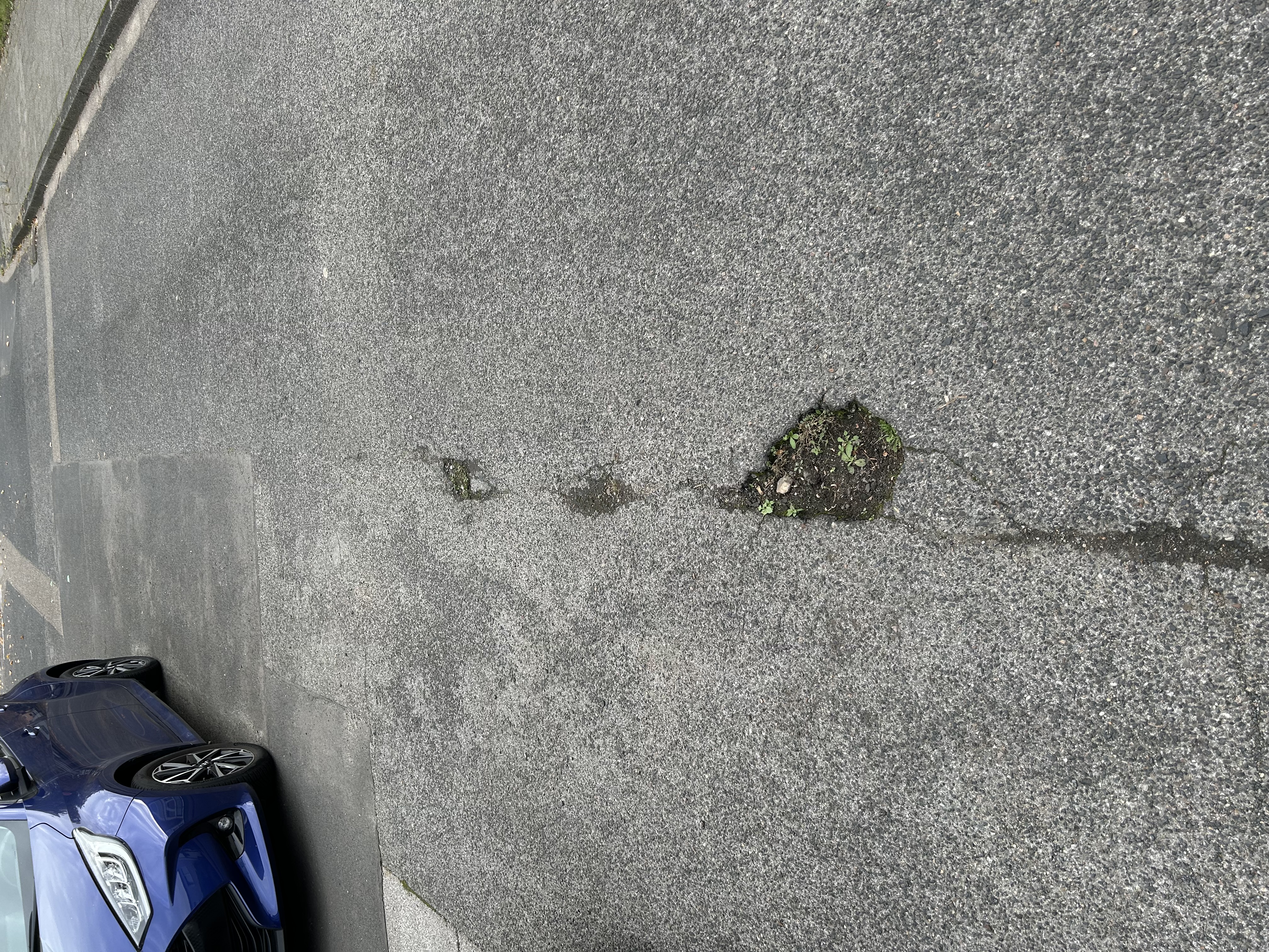 Das Schlagloch befindet sich in der Mitte der Fahrbahn, so dass spielende Kinder oder Erwachsene mit ihren Rädern gefährlich stürzen können.
