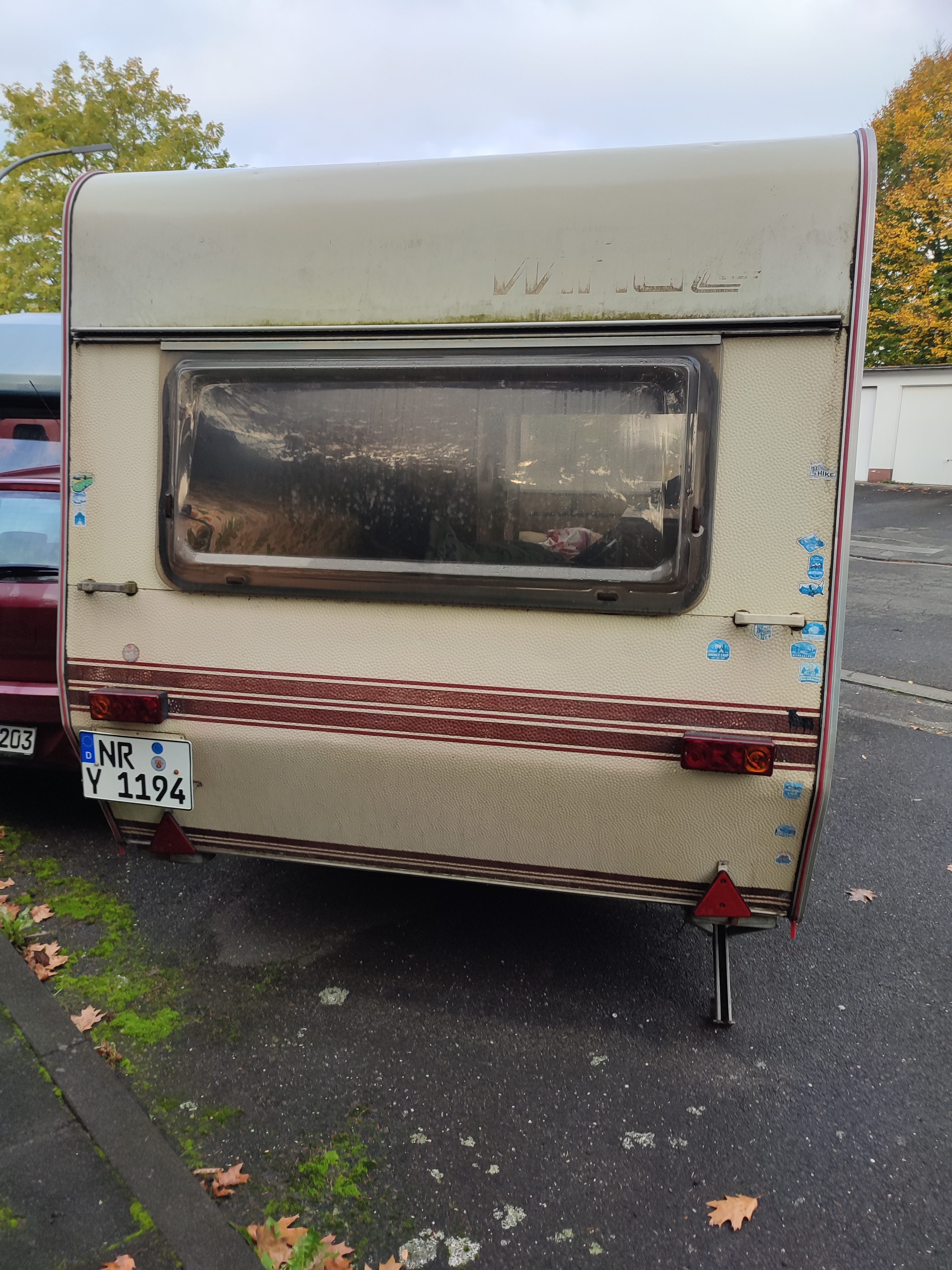 Dieser Wohnanhänger, steht seit August, also schon wieder länger als 2 Wochen unbewegt in der Parkbucht. Er steht monatelang dort.