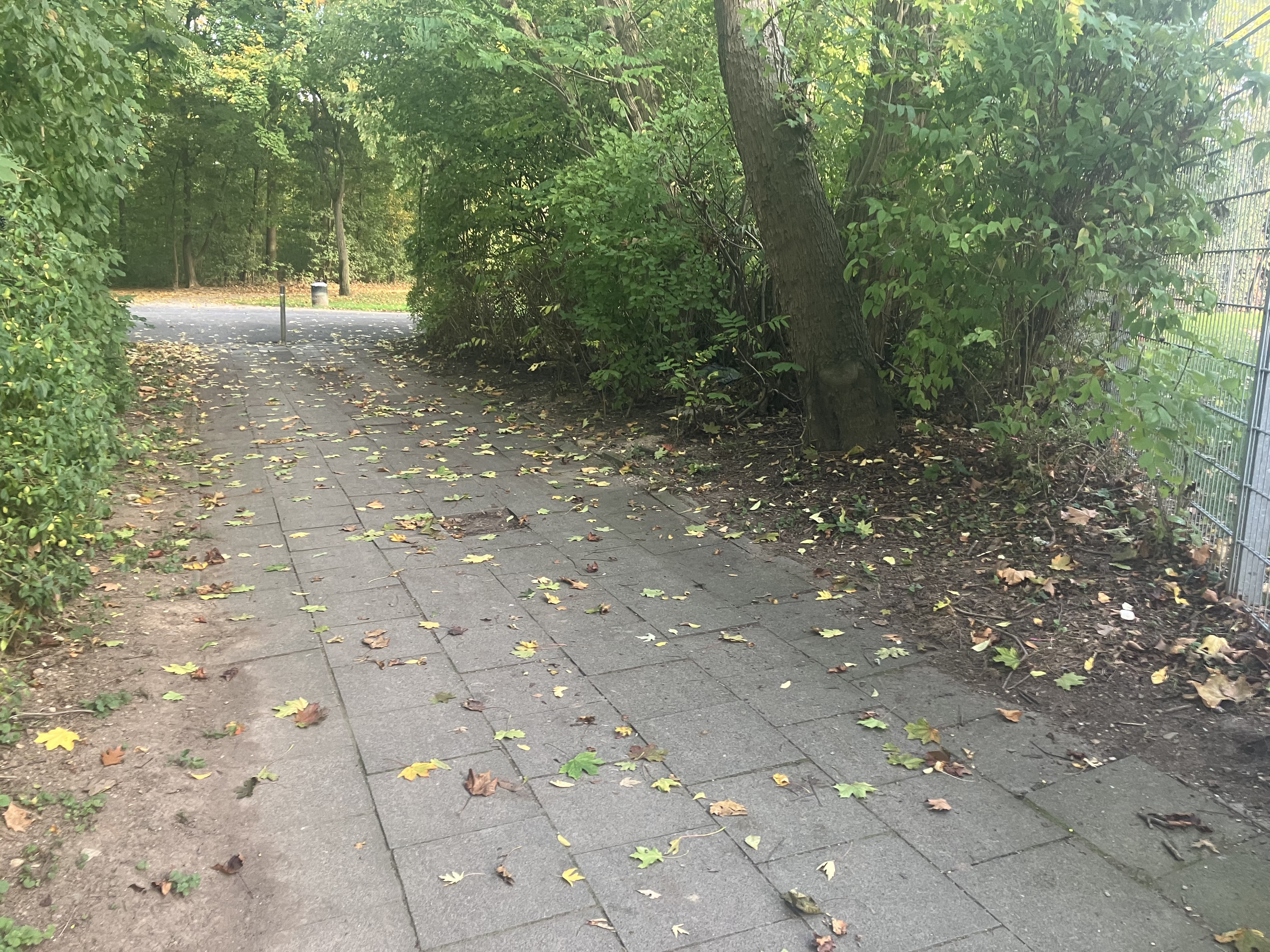 Platte (~40 x 40 Zentimeter) aus Weg (Breite = 6 Platten) liegt im Gebüsch daneben.