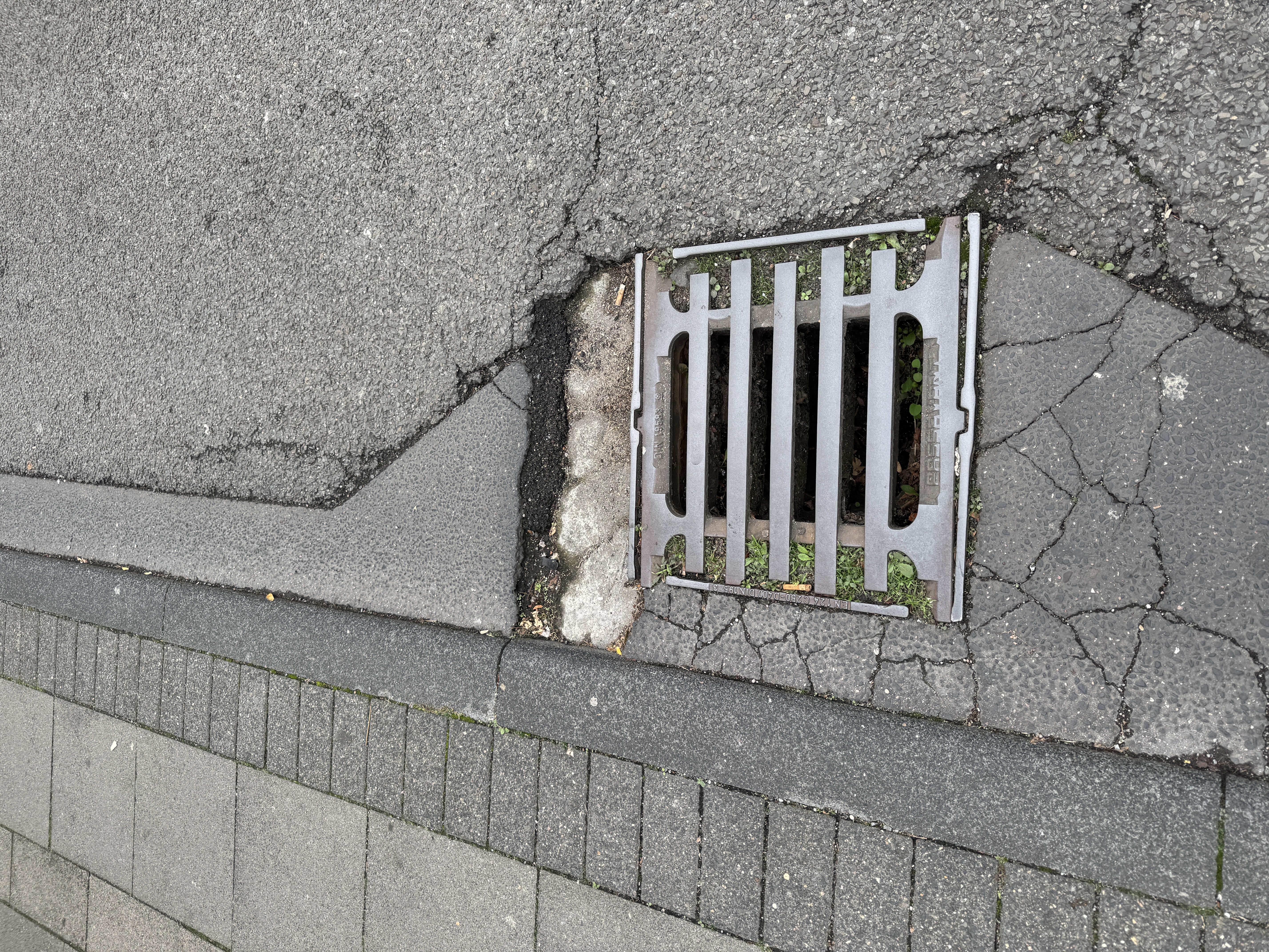 Darüber hinaus dringt über das Loch Wasser in die Straßenschicht ein, was dazu führt, dass der Gully allmählich absinkt. Das ist gefährlich für Radfahrer und Autofahrer und könnte sich mit der Zeit weiter verschlimmern.