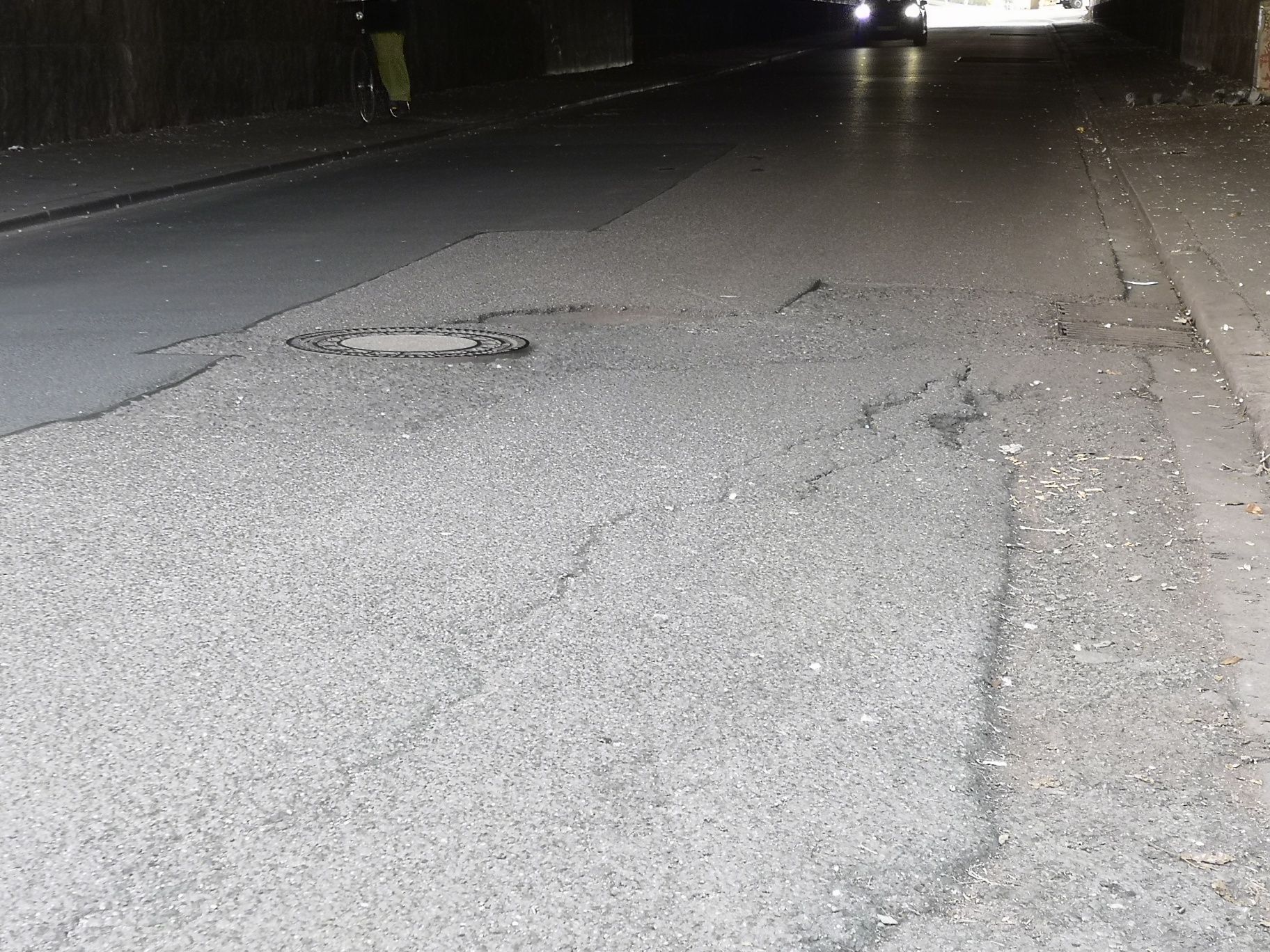Unmittelbar vor dem Eisenbahntunnel am Ende der Sonderburger Straße Fahrtrichtung Frankfurter Straße in Mülheim sind Radfahrer gezwungen, nicht nur in einen unzulänglich beleuchteten dunklen Tunnel zu fahren, sondern müssen sich gleichzeitig auch noch den Weg durch eine schlaglochartigen Fahrbahnaufriss bahnen. Nach einer Kanalreparatur zwischen Gullydeckeln auf der Fahrbahnmitte und dem Fahrbahnrand ist die Fahrbahndecke so mangelhaft repariert worden, dass Radfahrer in den Gegenverkehr ausweichen müssen, um nicht durch den unübersichtlichen Aufriss fahren zu müssen. Ich weise darauf hin, dass diese Wegführung die direkte Verbindung des zukünftigen inzwischen beschlossenen Radschnellweg Bergisch Gladbach – Köln zur Mülheimer Brücke darstellt.