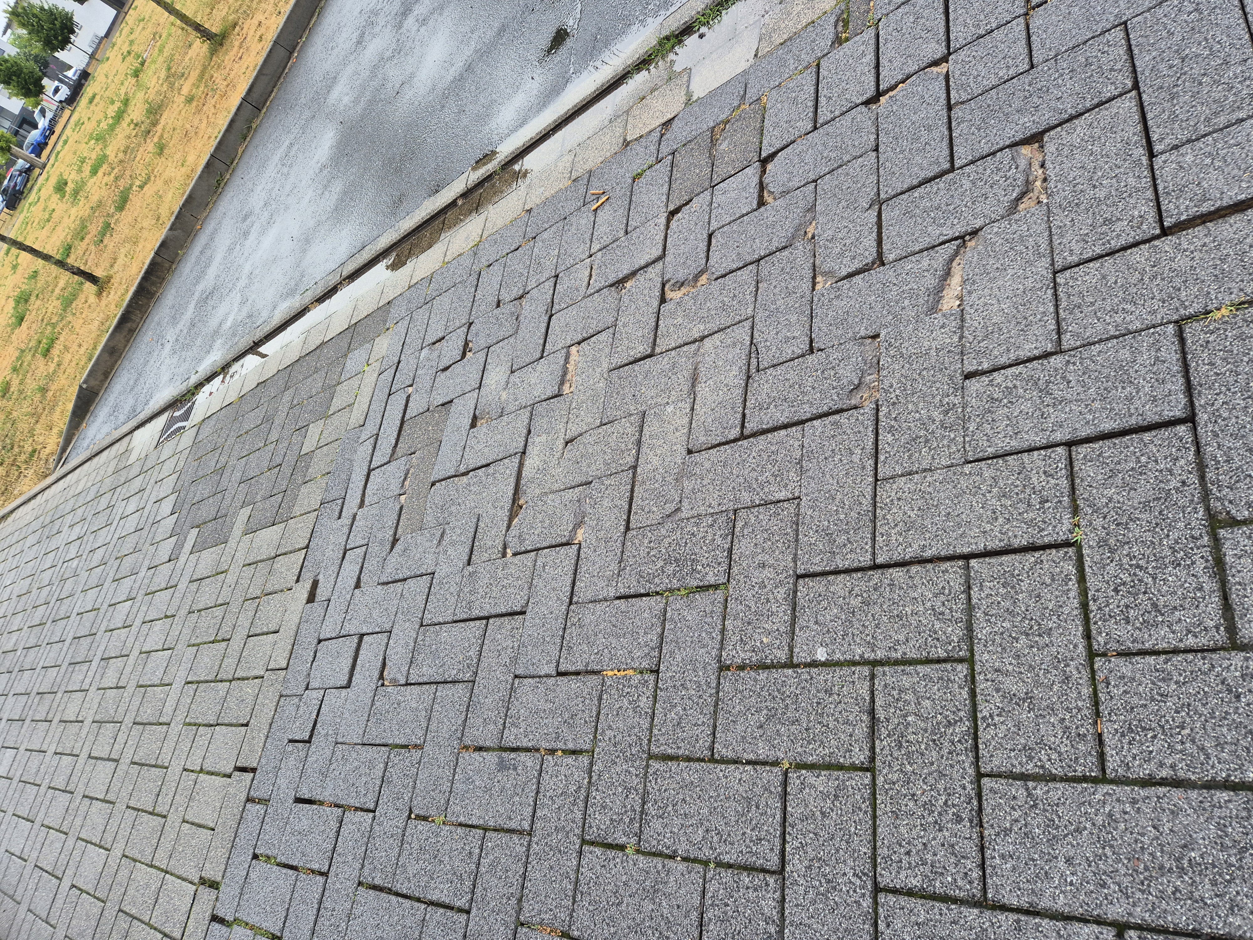 Spielstraße: Platten defekt (lose) auf mind. 5qm Fläche/Absplitterungen. Gefährliche Kante für spielende Kinder (Roller), Stolpergefahr