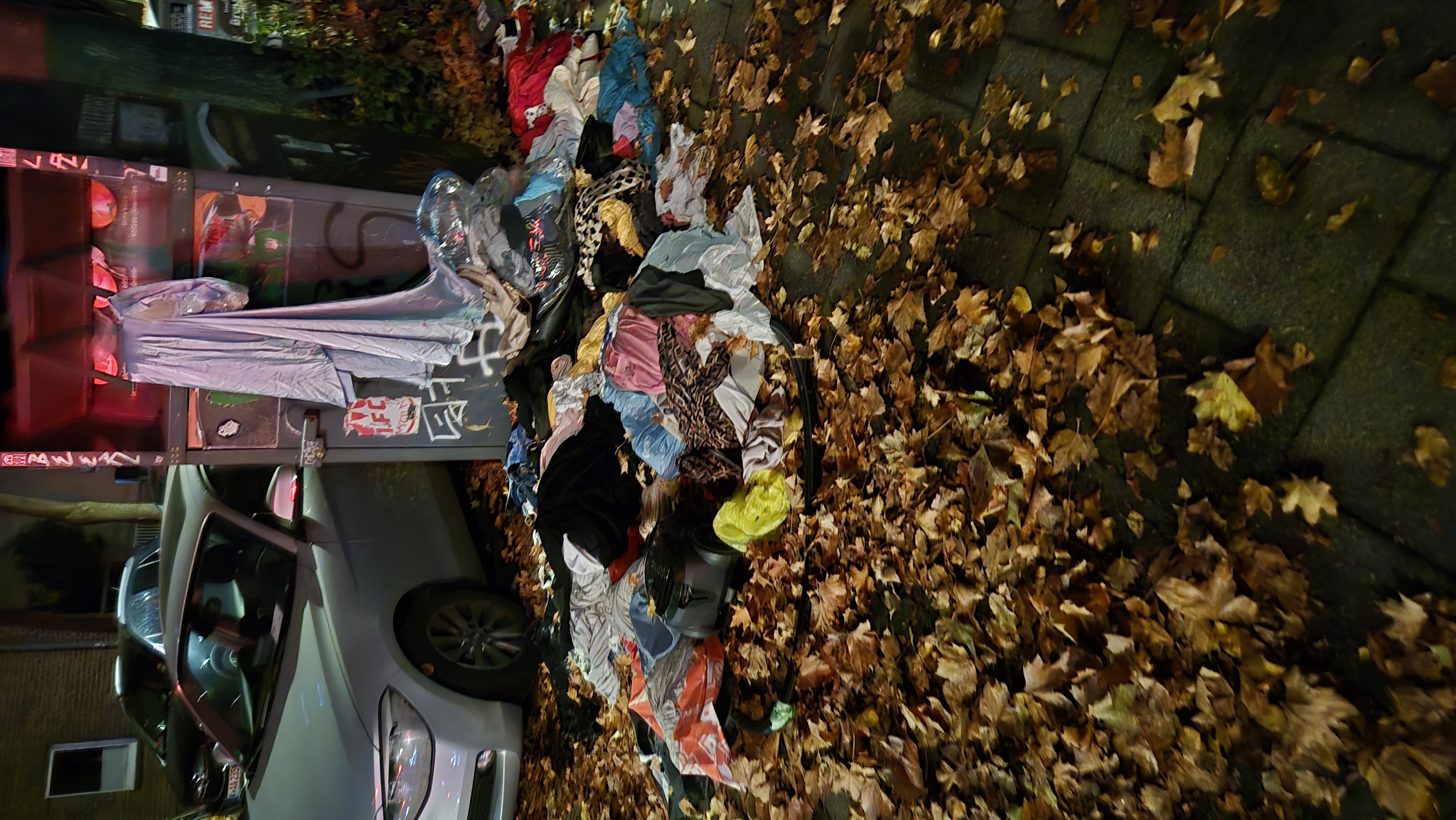 Container entleert, und vor den Container geschmissen, teilweise muss man drübersteigen, wenn man den Bürgersteig benutzt.