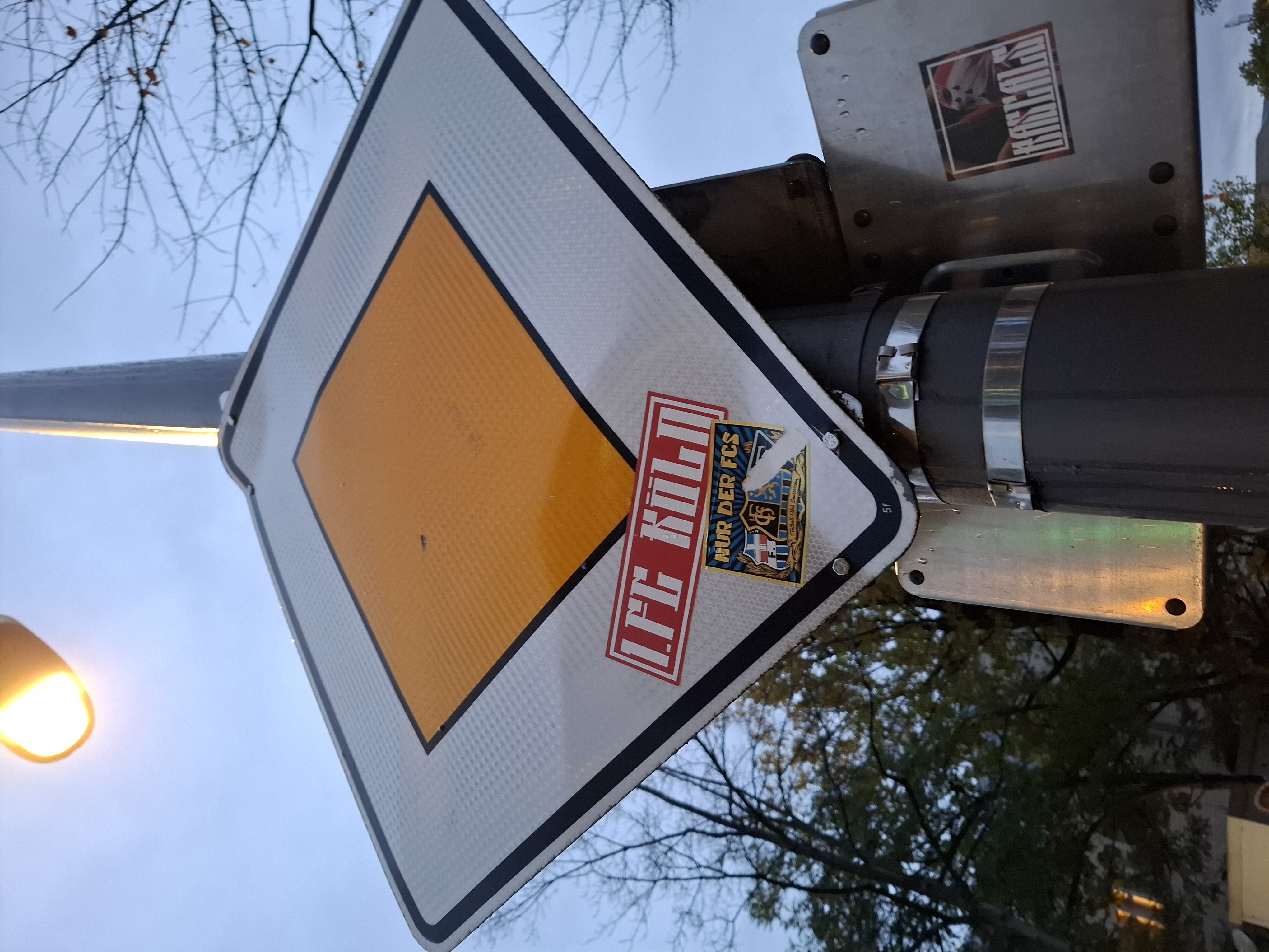 Beeinträchtigtes Verkehrsschild durch Verunreinigung mit Klebestickern; diese bitte entfernen, vielen Dank.