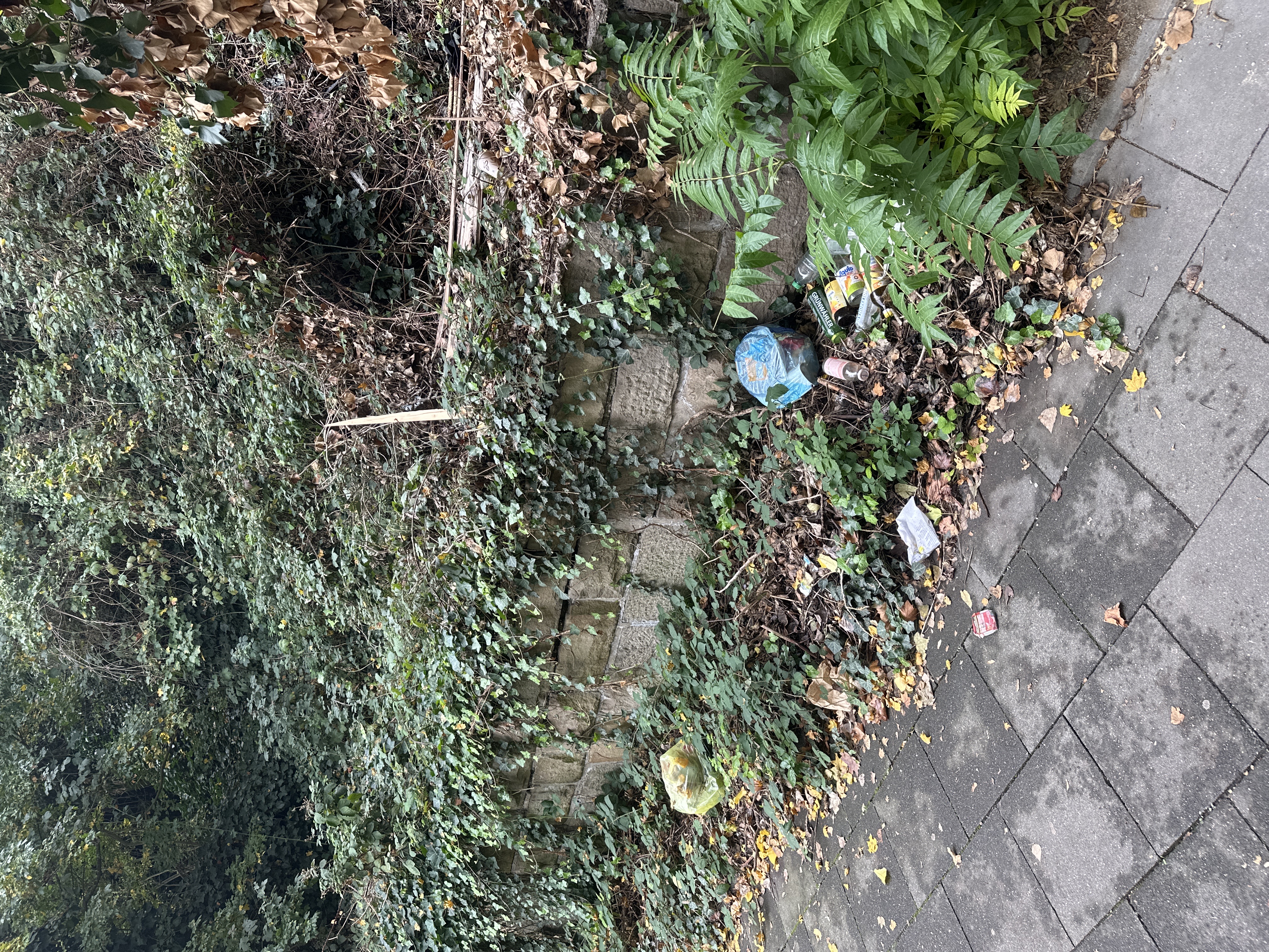 Leider liegt hier wie auf der kompletten Straße überall Müll im Grün