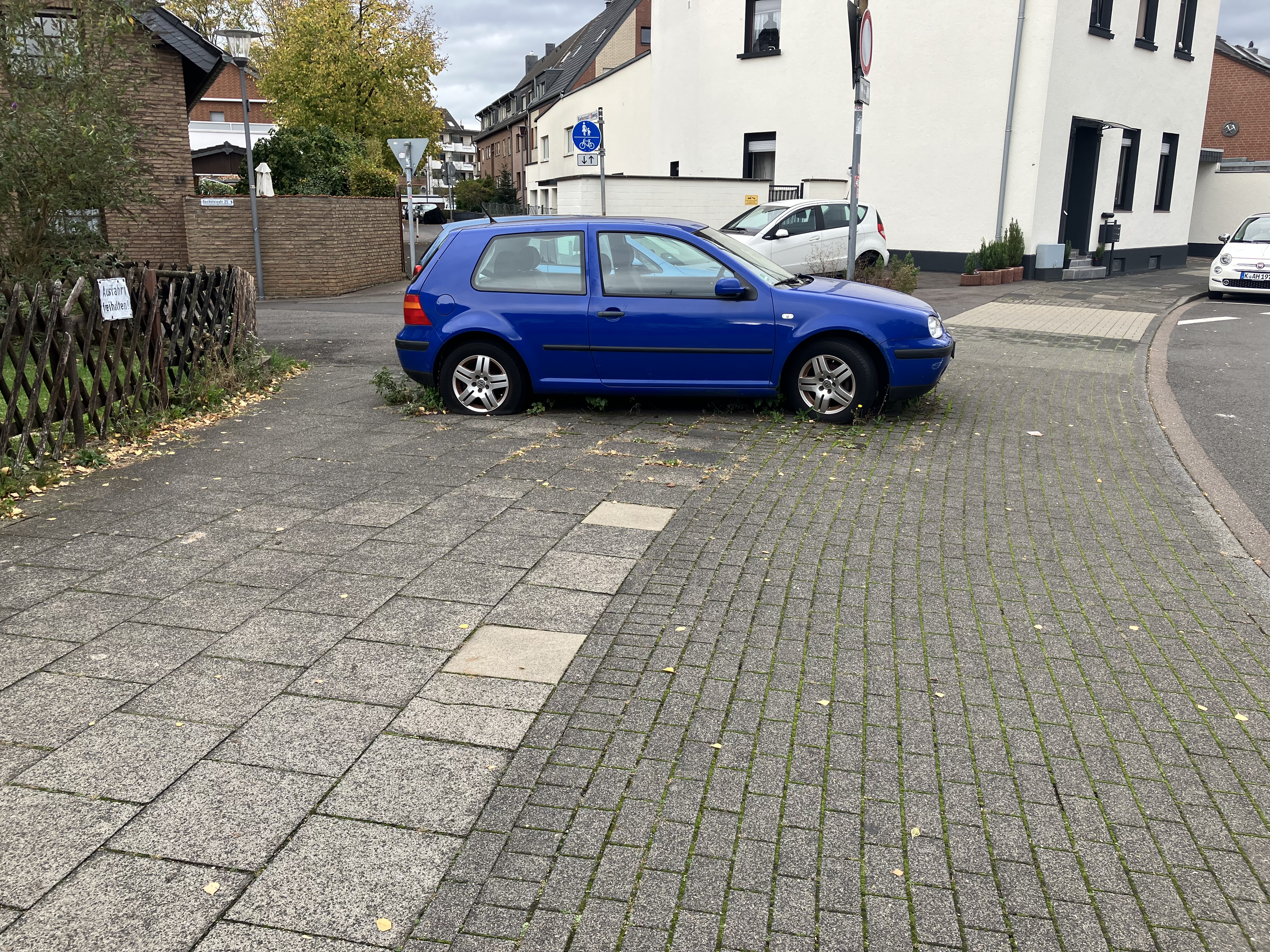 Blauer Golf mit HU Plakette 9/23, steht/parkt mit Frontseite ~1,20 Meter auf dem Gehweg. Rechter Hinterreifen ist platt, Innenraum (Lenkrad, Fußraum/Sitzfläche Fahrerseite,…) teils mit Schimmelspuren.