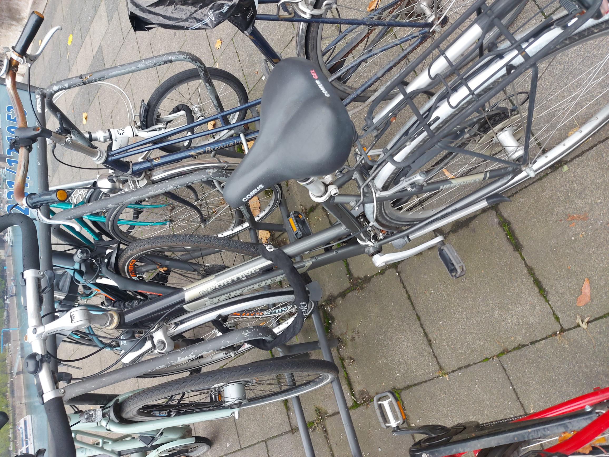 Dieses Fahrrad (Sporting Hercules) steht unmittelbar vorm Haupteingang des St. Vincenz-Hauses festgeschlossen seit mindestens 10 Monaten ununterbrochen. Bzw. unmittelbar an der gleichnamigen Bushaltestelle. Konrad-Adenauer-Ufer 55