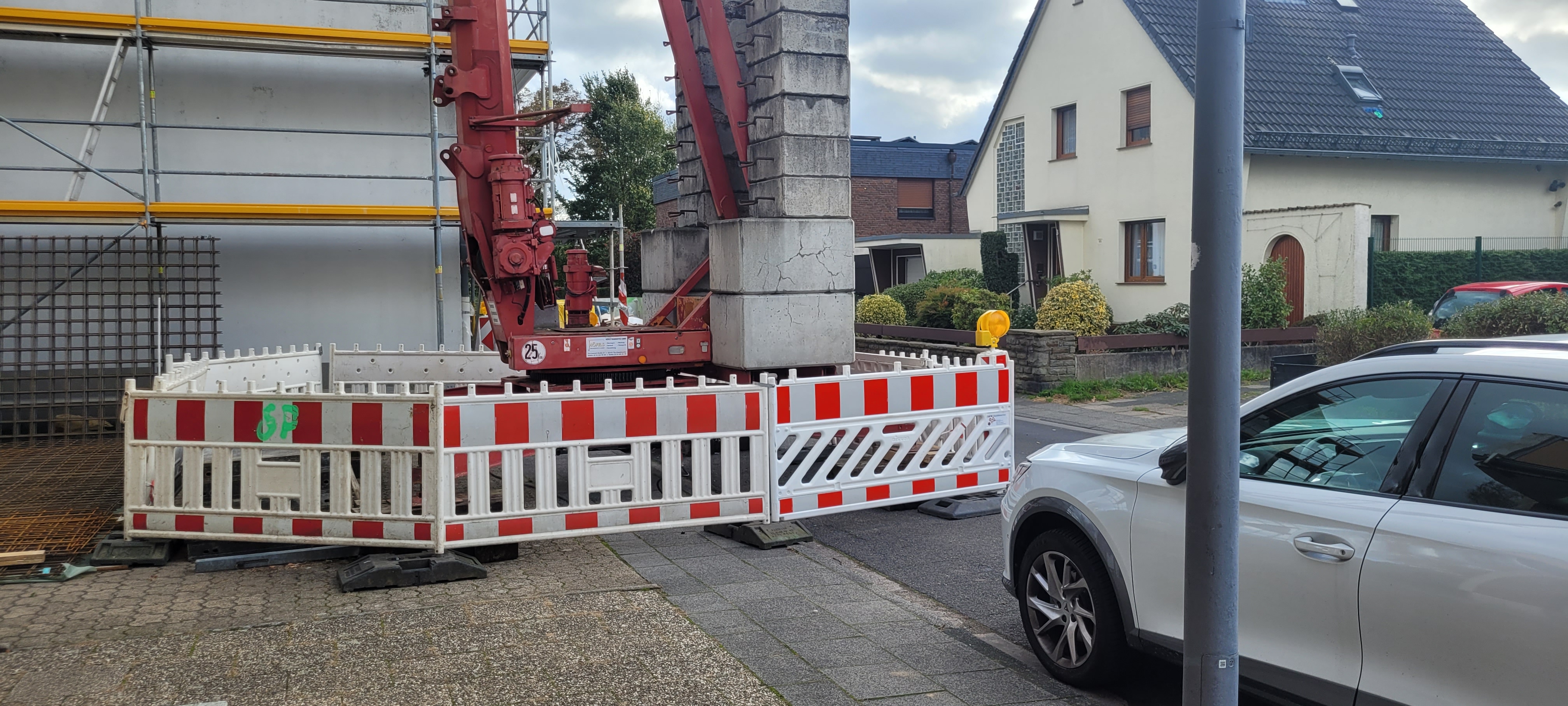 Aufgrund der Bauarbeiten müssen Fußgänger vorübergehend auf die andere Straßenseite wechseln, was bei einer Einbahnstraße mit einem 30 km/h Tempolimit legitim ist.