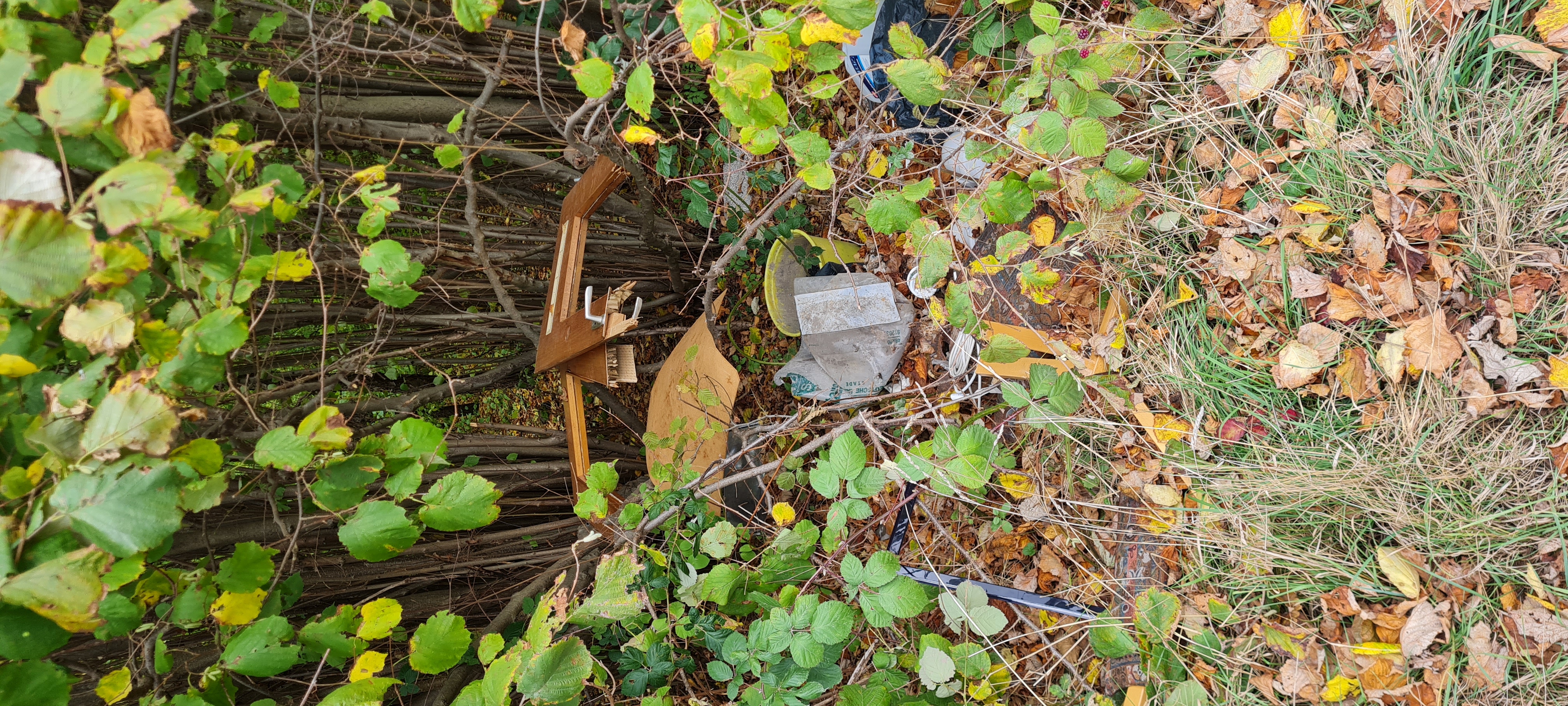 Wilder Müll (mittig zwischen Parkplatz und Sportheim) liegt rechts im Gebüsch