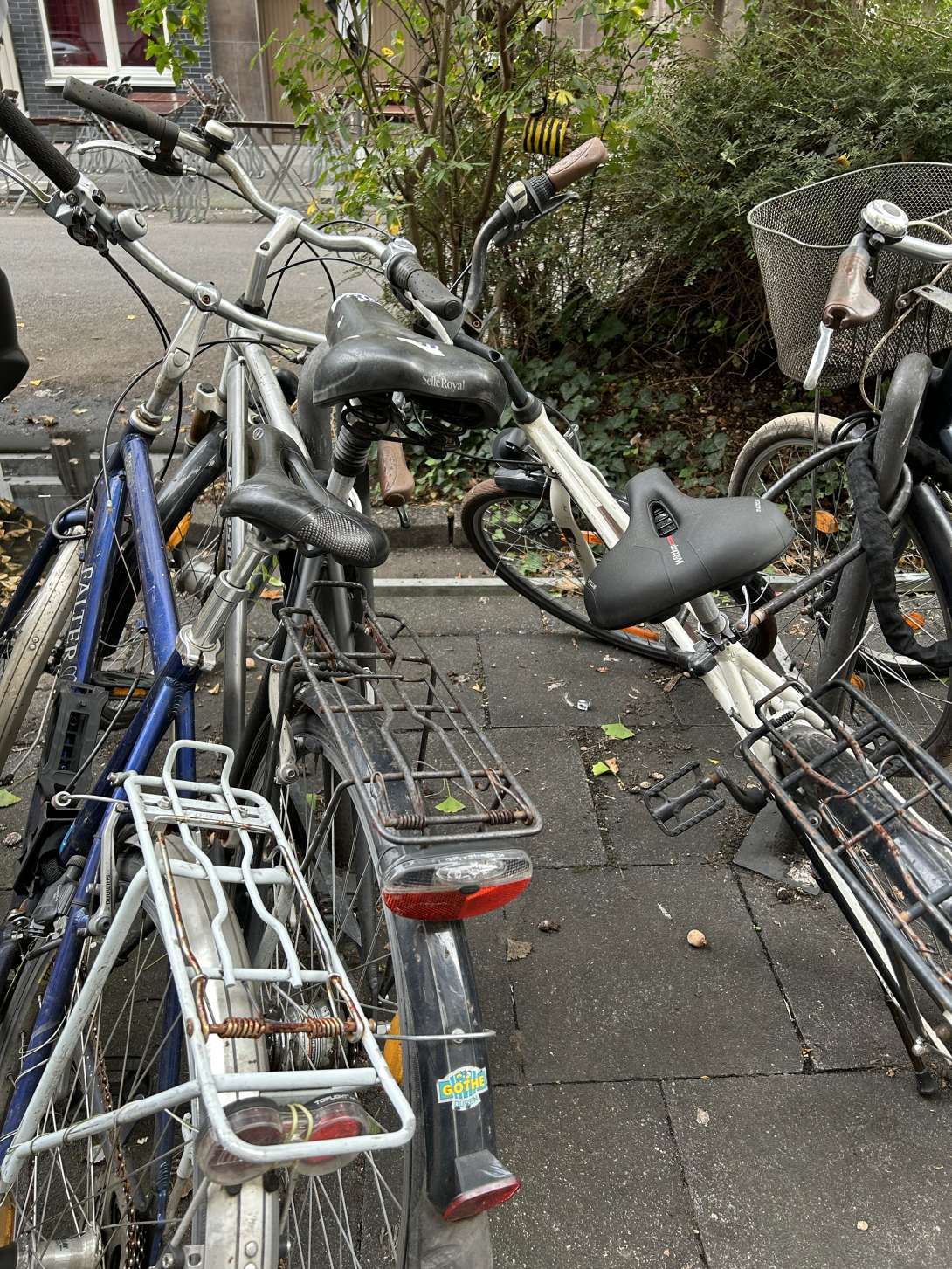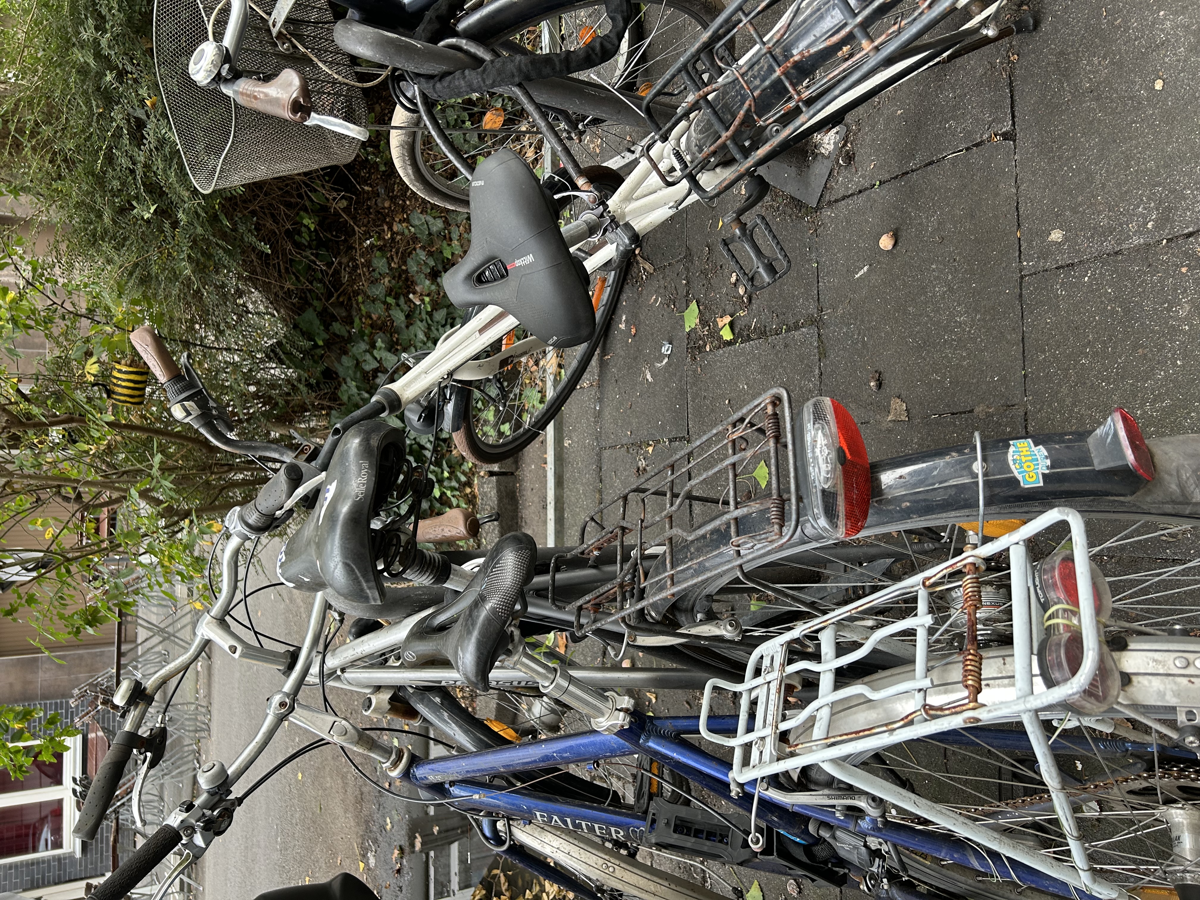 Es stehen drei Schrottfahrräder vor dem Haus Brüsseler Str. 9