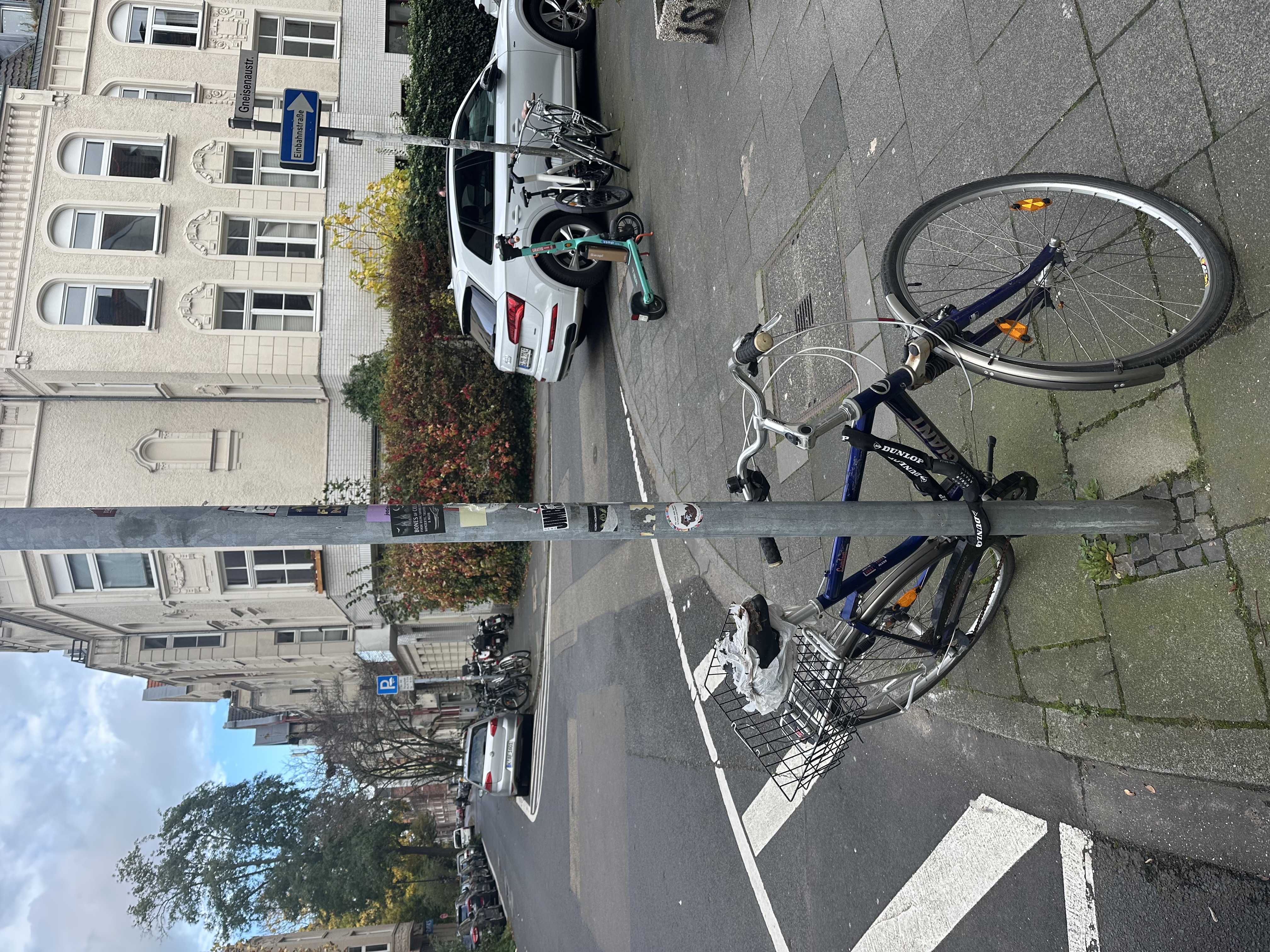 Das Fahrrad ist an dem Mast angebunden und wird nicht benutzt. Der optische Zustand entspricht einem Müllfahrrad. Bitte entsorgen.