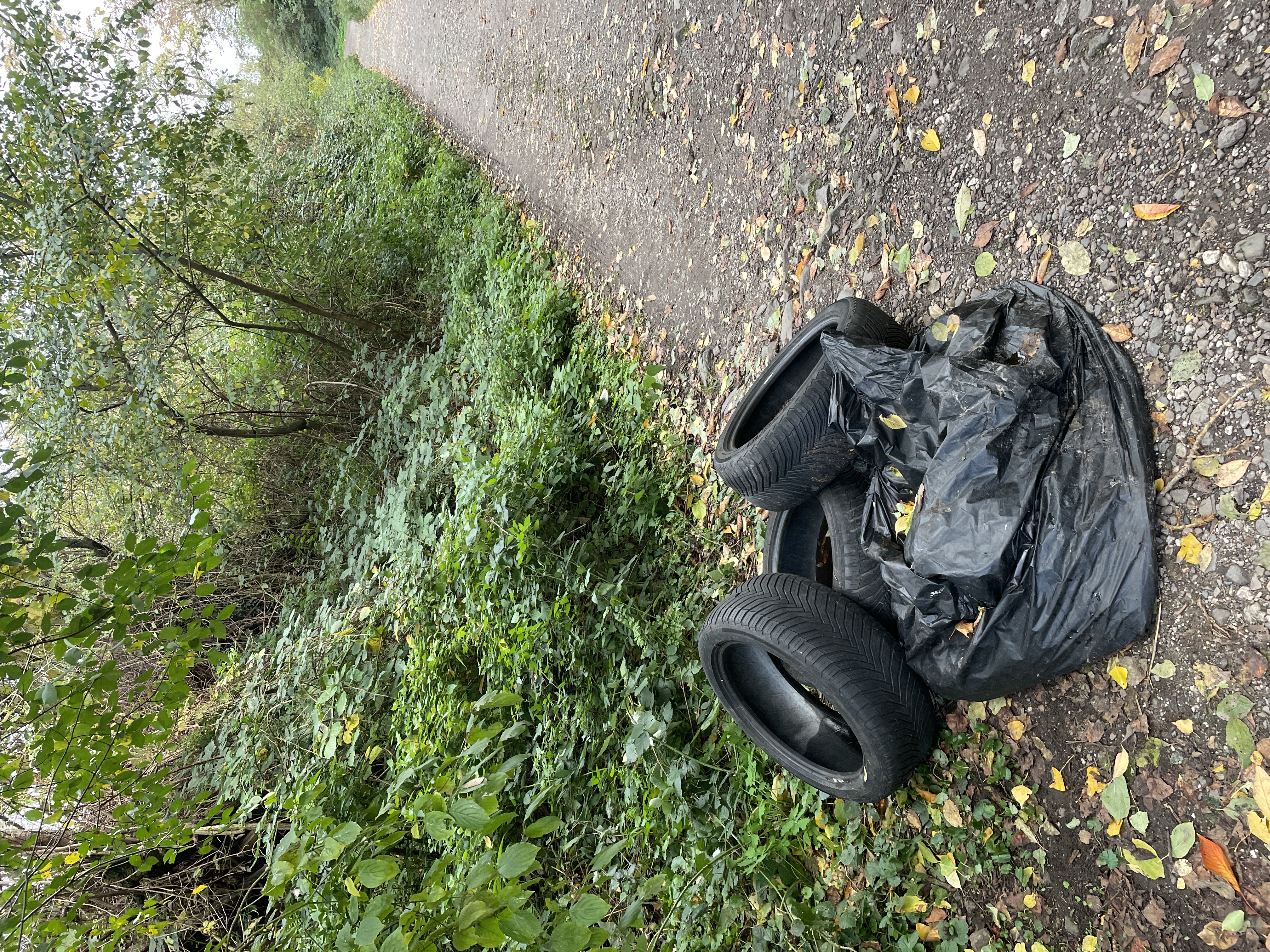 Wilder Müll - vier alte Atoreifen in schwarzer Plastiktüte