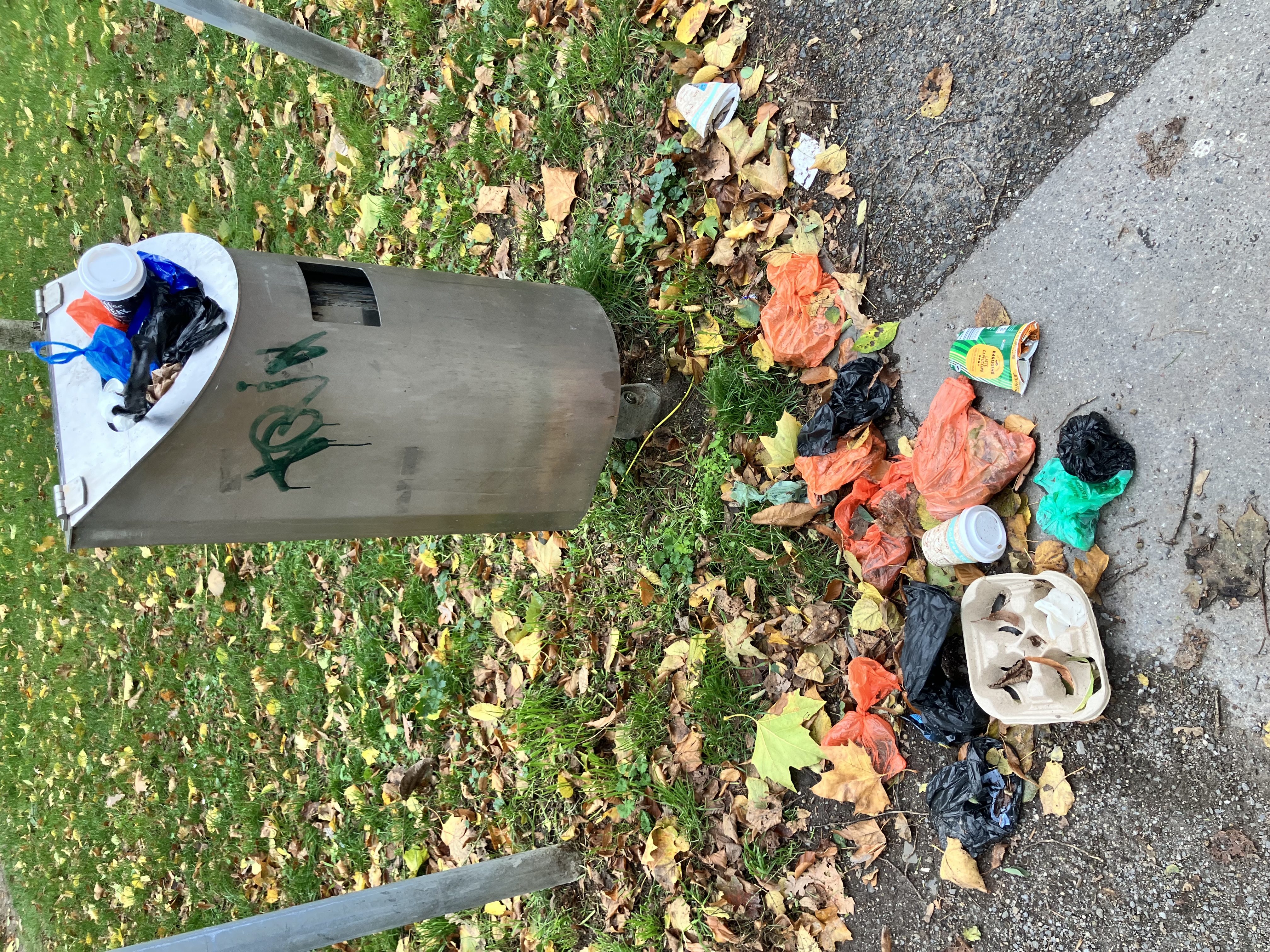 Übervoller Abfalleimer mit der bereits neben dem Eimer liegt. Eimer muss geleert werden DANKE!!