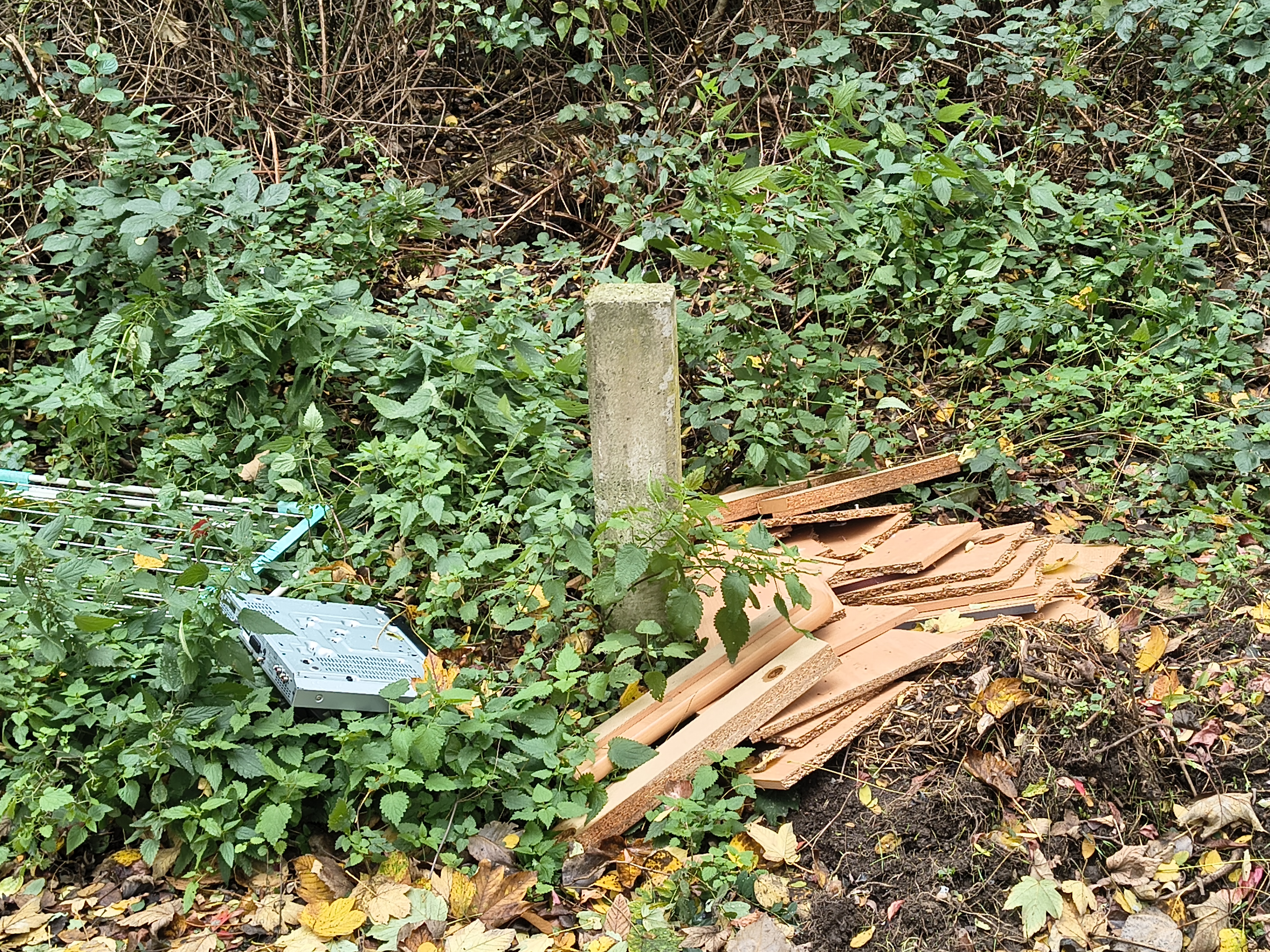 Ein Wäscheständer, Sperrholzteile und ein Elektrogerät liegen im Gebüsch