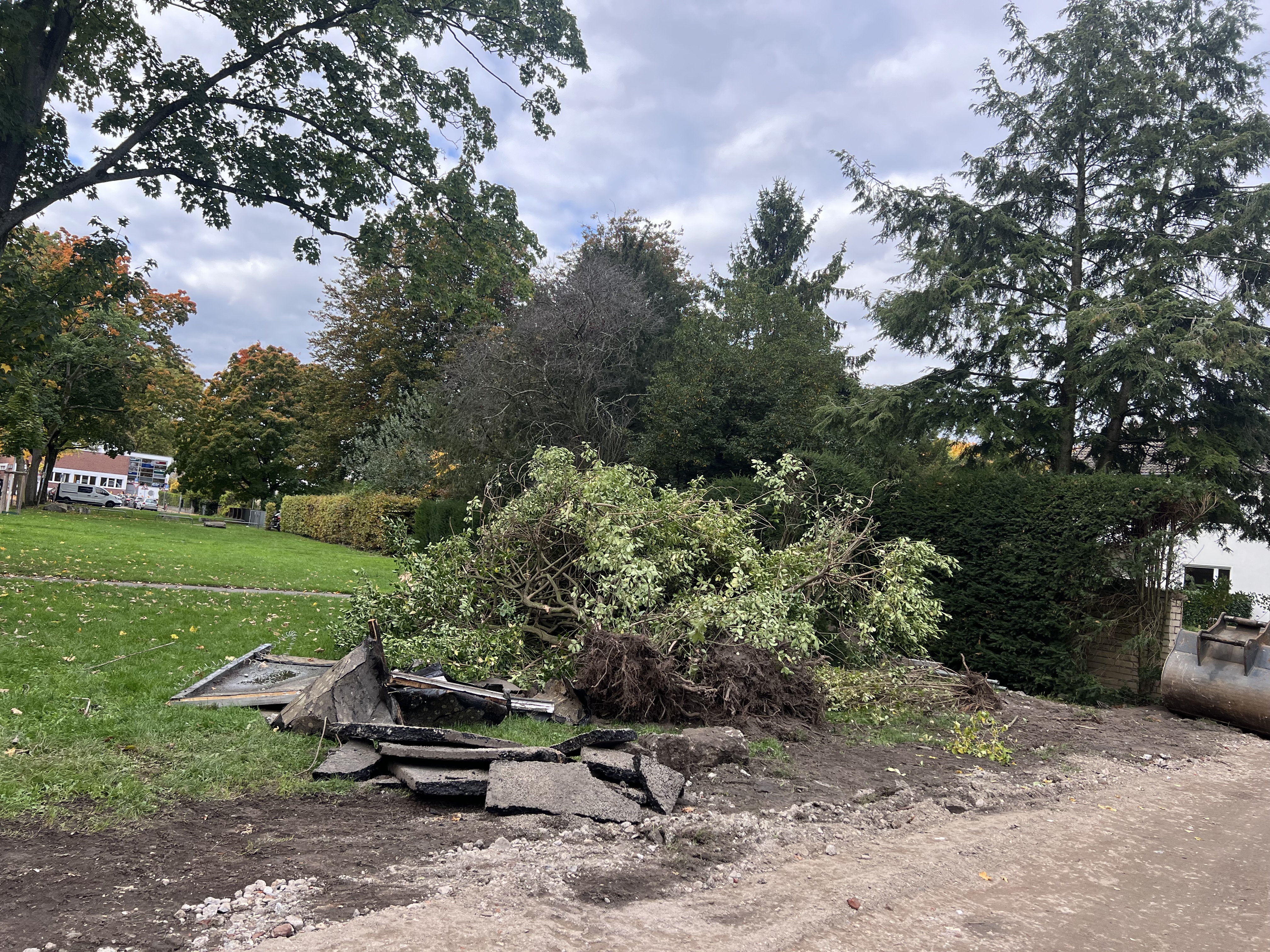 Es wurde eine Baustelle eingerichtet am Neusser Wall 14.10. . Die abgerissene Hecke liegt seitdem auf der öffentlichen Grünanlage.