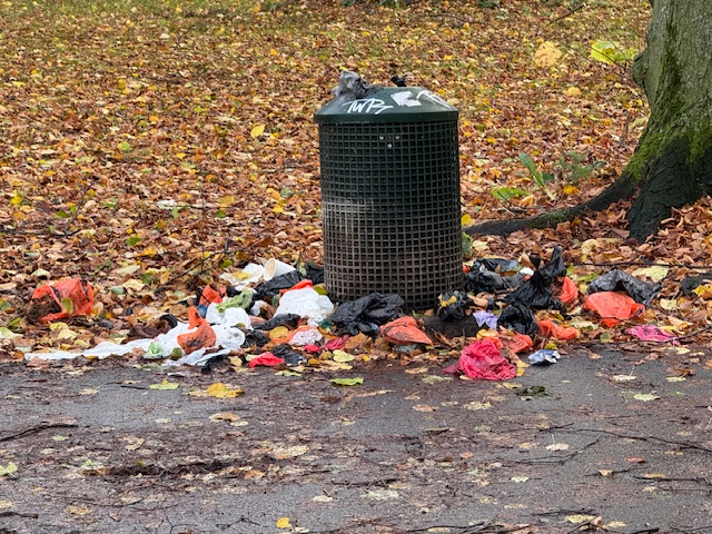 Seit über drei Wochen werden alle auf der Statthalterhofallee auf dem Grünstreifen der Allee befindlichen Mülleimer nicht mehr geleert. Mittlerweile haben Anwohner bereits zusätzliche Müllsäcke aufgehangen.