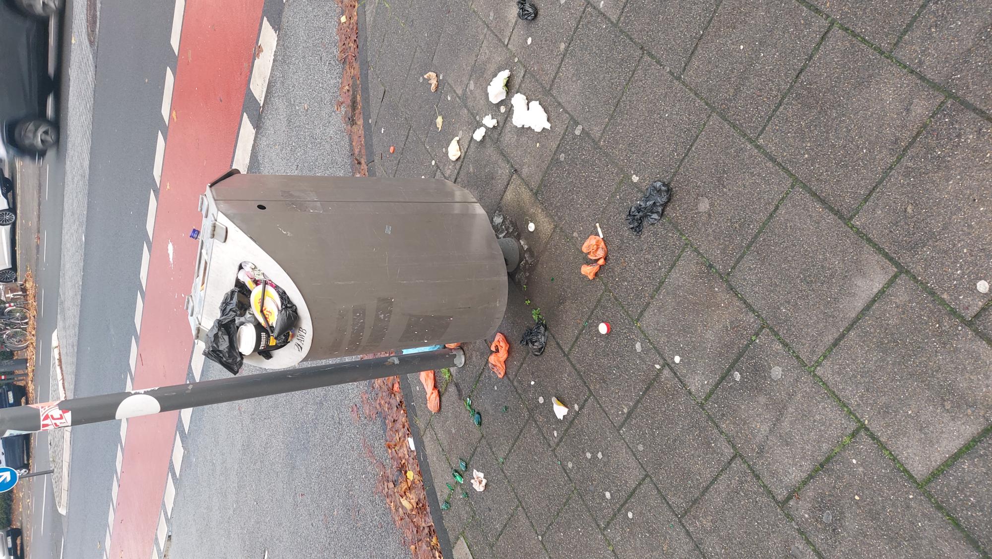 Der Müllbehälter Vogelsangerstr. Ecke Fuchsstr. ist regelmässig überfüllt. Der Wind weht den Müll in die Vorgärten und die Strasse. Zudem durchsuchen die Raben den Müll