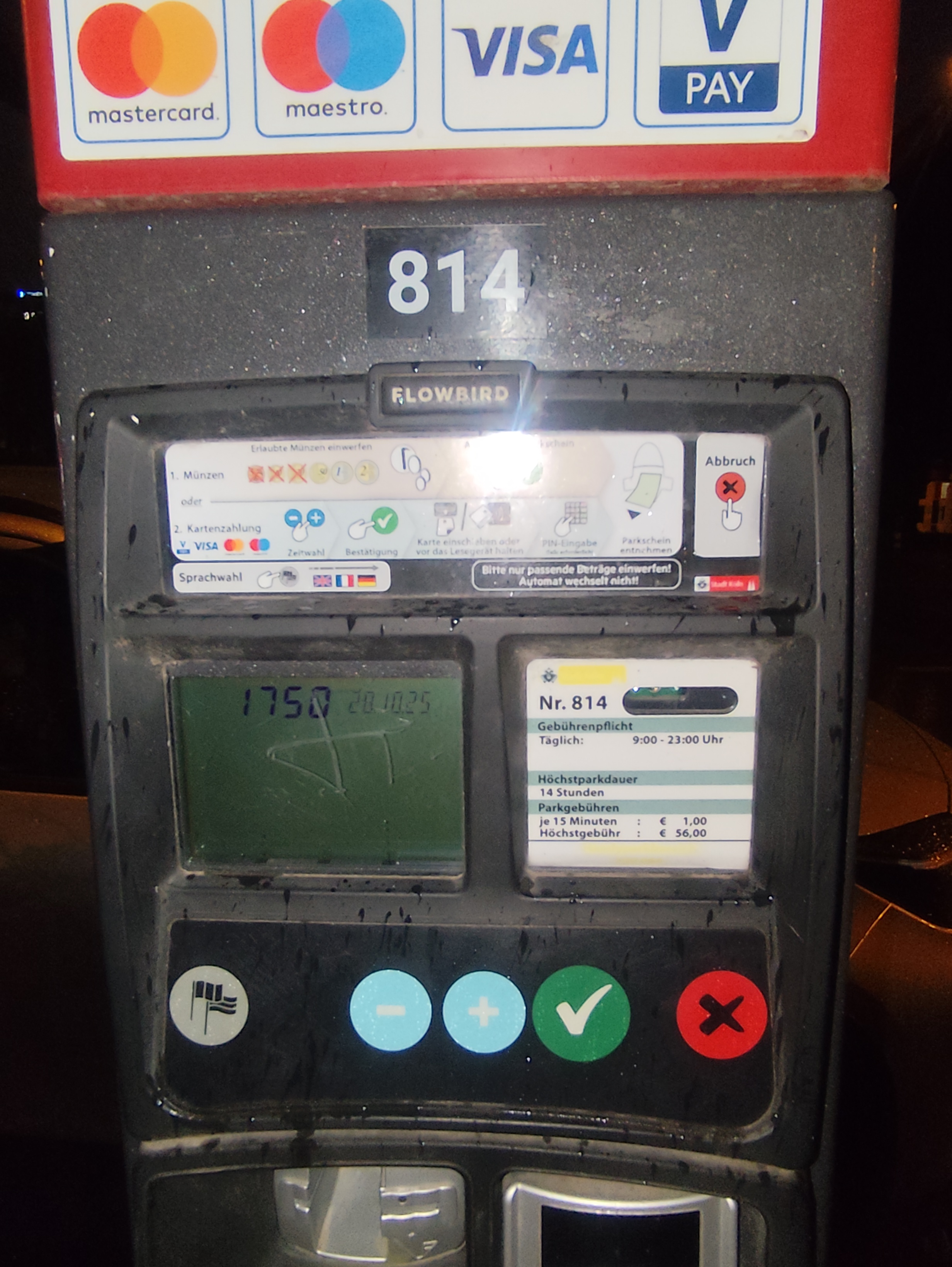 2 x per EC-Karte 19,00 €bezahlt. Es kommt kein Parkticket raus, welches man ins Auto legen könnte.