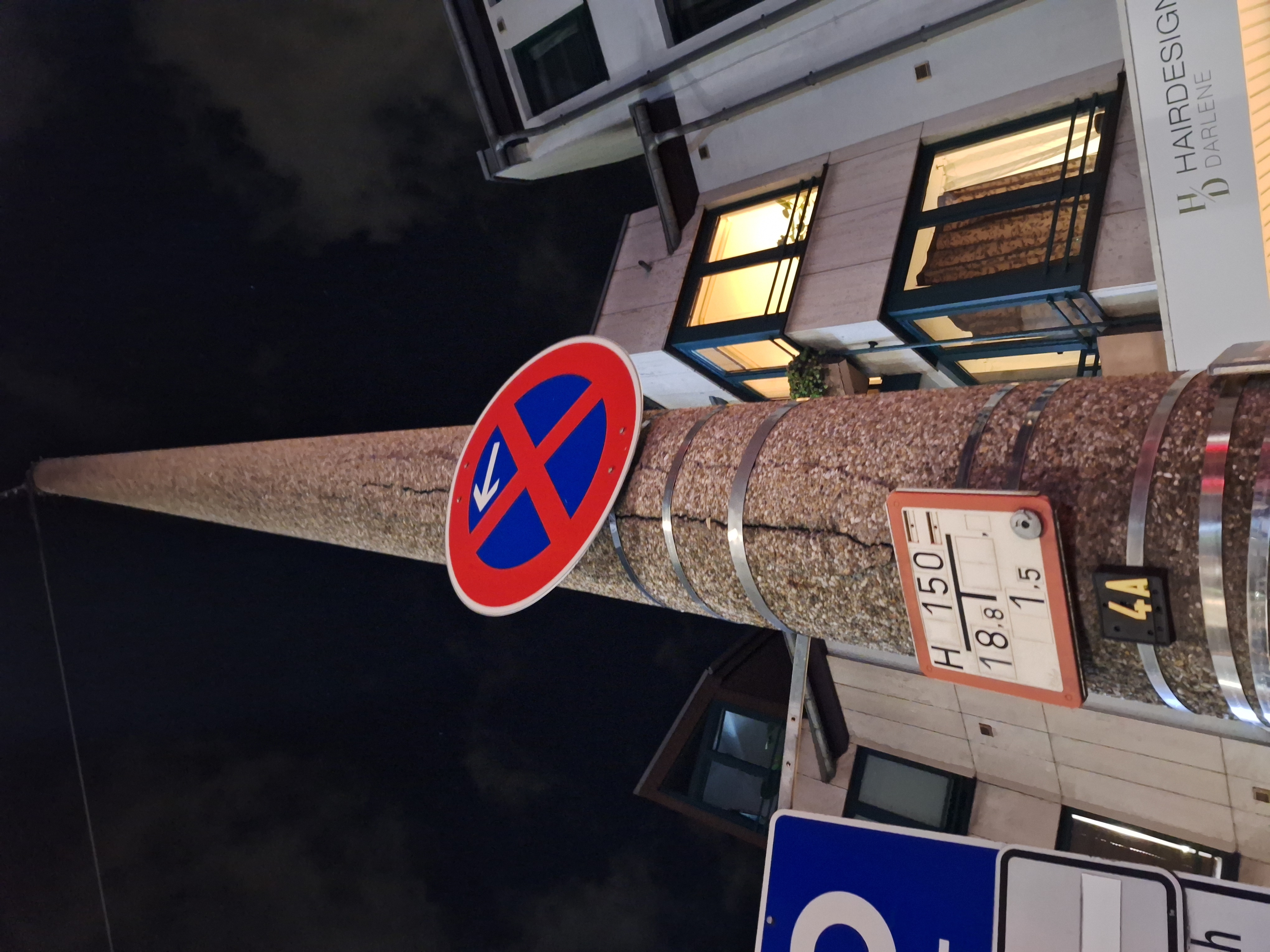 Stahlbetonmast mit Bezeichnung "4A" Starke Betonabplatzungen an mehreren Stellen. Bewehrung großflächig sichtbar, Betonteile lösen sich in mehreren Metern Höhe