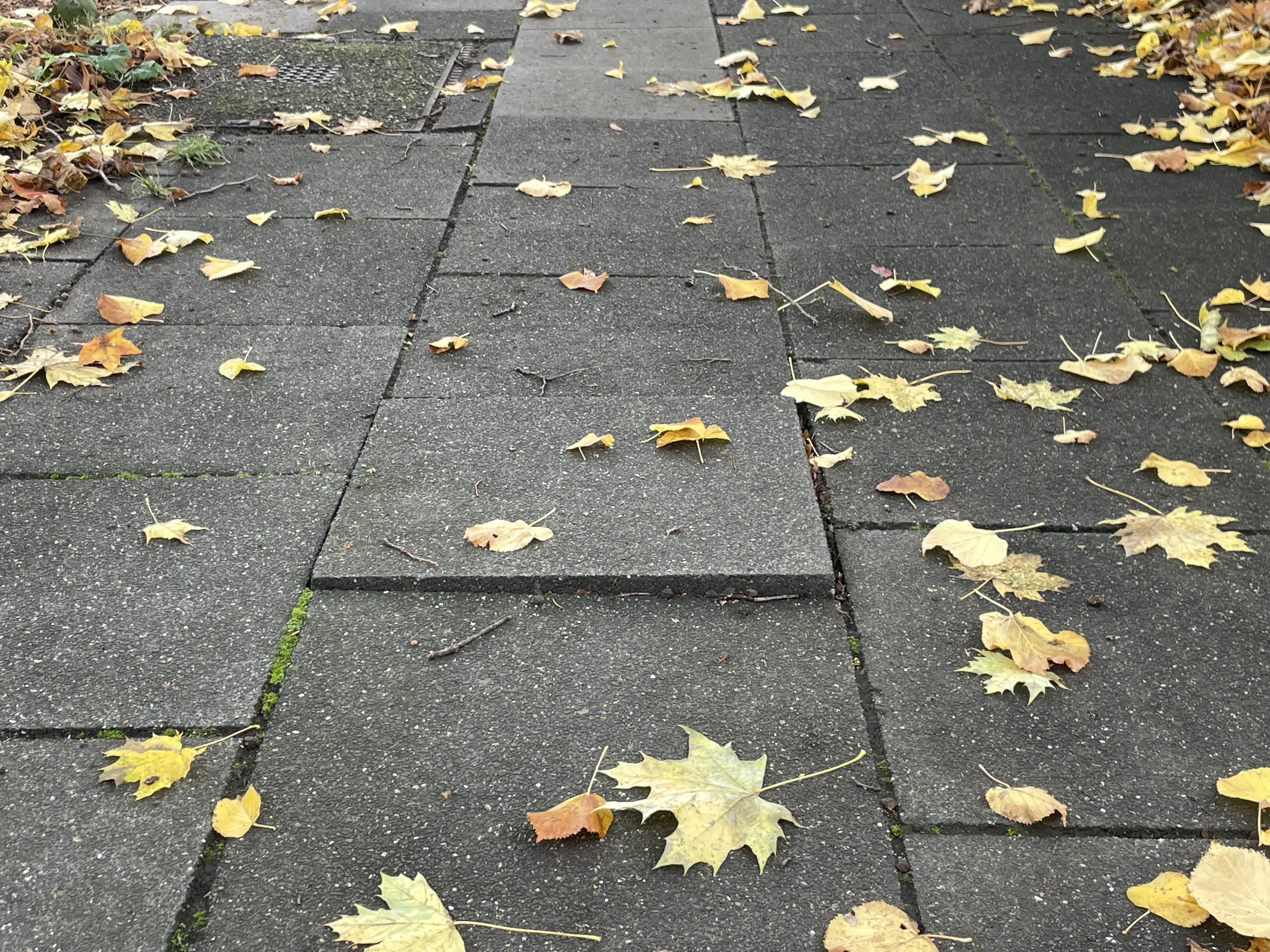 Gehwegplatten vermutlich durch Wurzeln hochgekommen. Stolpergefahr. Mehrere Platten betroffen.