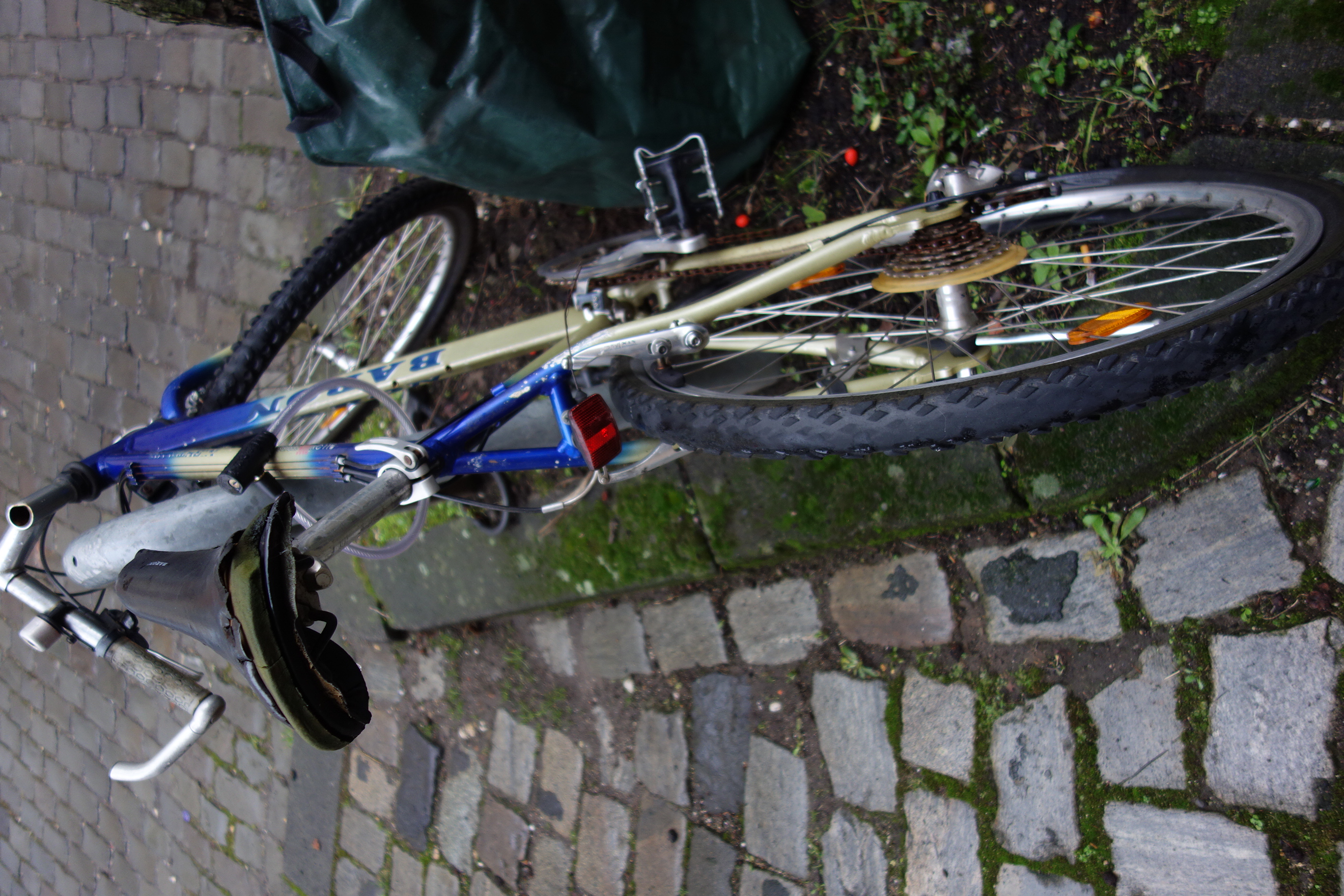 Seit Monaten steht eine Fahrradleiche am Baum vor dem Haus Manderscheider Straße 6 in 50937 Köln. Platter Reifen, verrostete Fahrradkette, aufgerissener Sattel. Bitte entfernen!