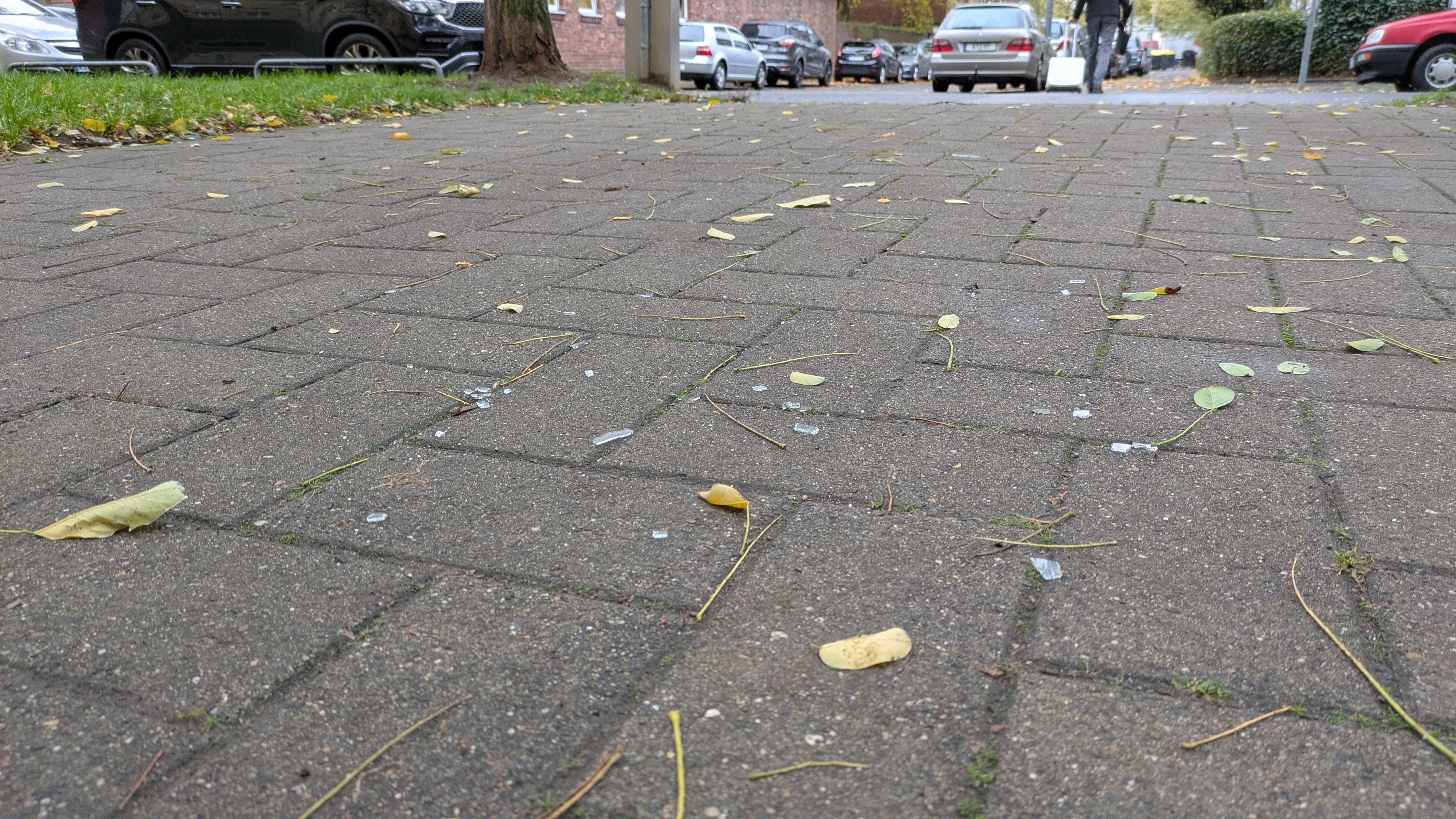 Viele zum Teil größere Glassplitter von Flachglas auf der Feuerwehreinfahrt.