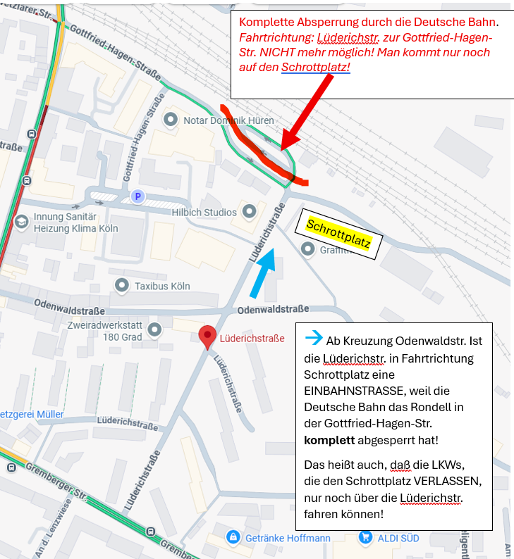 in der Lüderichstr. fehlen Beschilderungen, daß diese ab Kreuzung Odenwaldstraße jetzt eine EINBAHNSTR. ist. Die deutsche Bahn hat das Rondell am Ende der Straße komplett eingezäunt, so daß man nur noch auf den Schrottplatz kommt. Die Gottfried-Hagen-Str. die in die Lüderichstr. einbiegt ist an der Stelle, eine Einbahnstraße. Fährt man also die Lüderichstraße in Richtung Schrottplatz, steht man am Ende vor einem Zaun und kann nur umdrehen. Die LKWs, die den Schrottplatz verlassen, können dies nur noch über die Lüderichstraße machen ! Die komplette Beschilderung dazu fehlt. Nirgendwo ist ein Hinweis, daß die Lüderichstr. nun eine Einbahnstraße ab Ecke Odenwaldstr. ist.