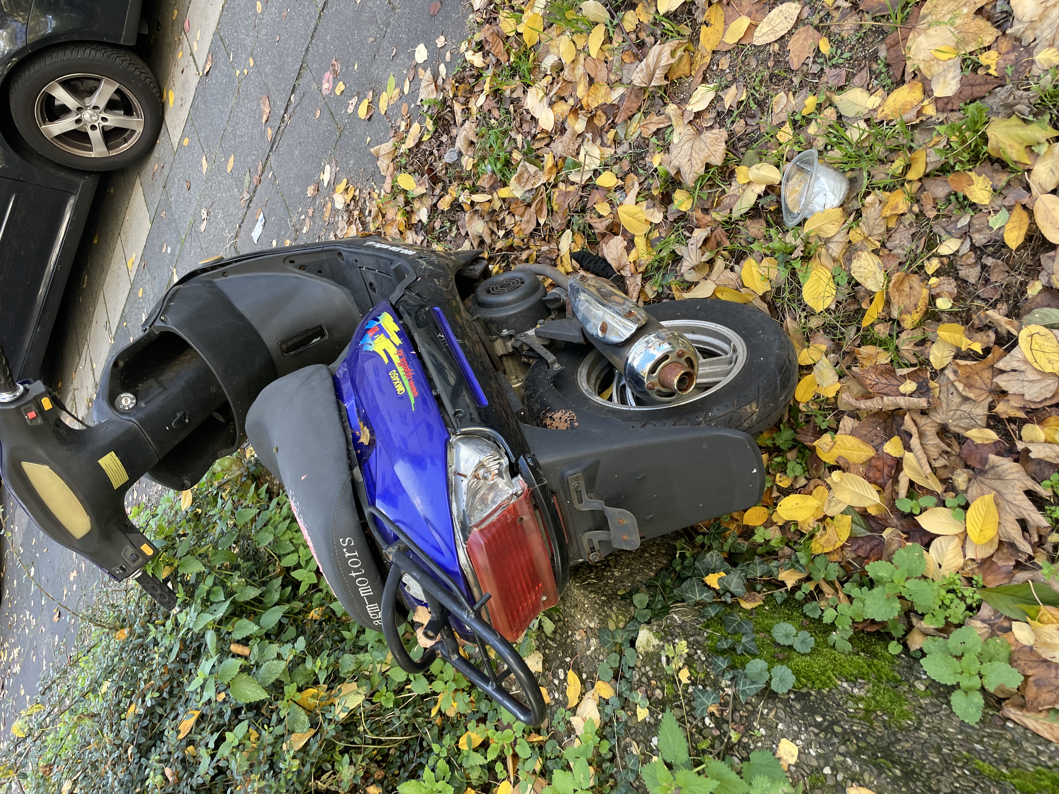 An der Spielplatz Mauer lehnt ein nicht gesicherter, abgemeldeter teilweise ausgeschlachteter Roller