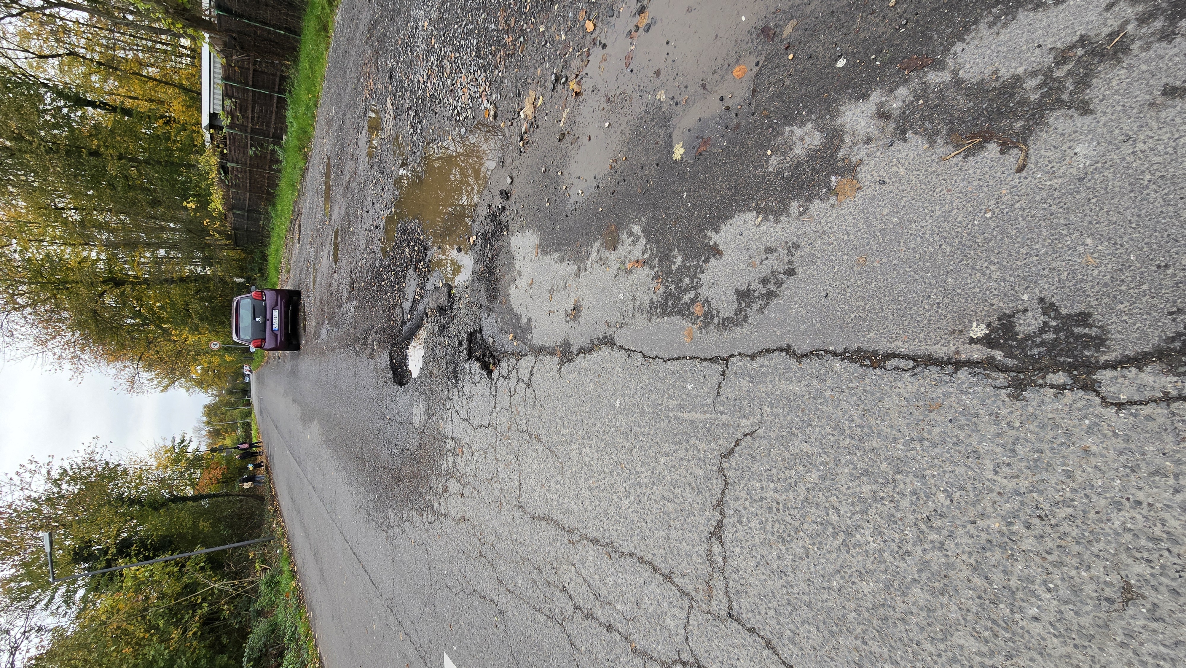 In Fahrtrichtung Kölner Straße auf der rechten Seite in Höhe der Schrebergärten Schlagloch/abgebrochener Fahrbahnrand von 20 cm Tiefe.