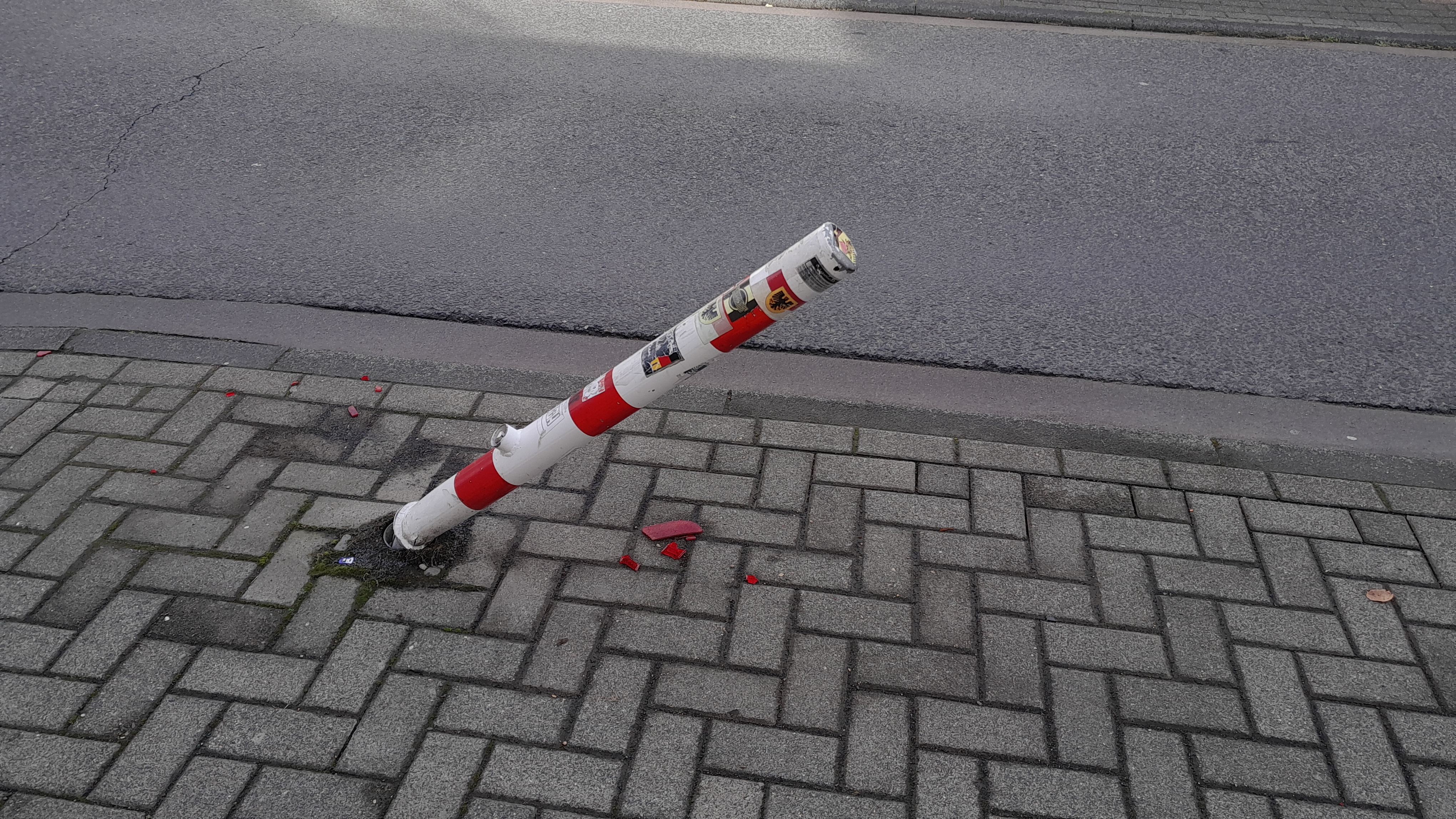 Dieser Poller ist beschädigt und steht in der Hahnenstr. zwischen HausNr. 12b und 14 in Köln- Rondorf.