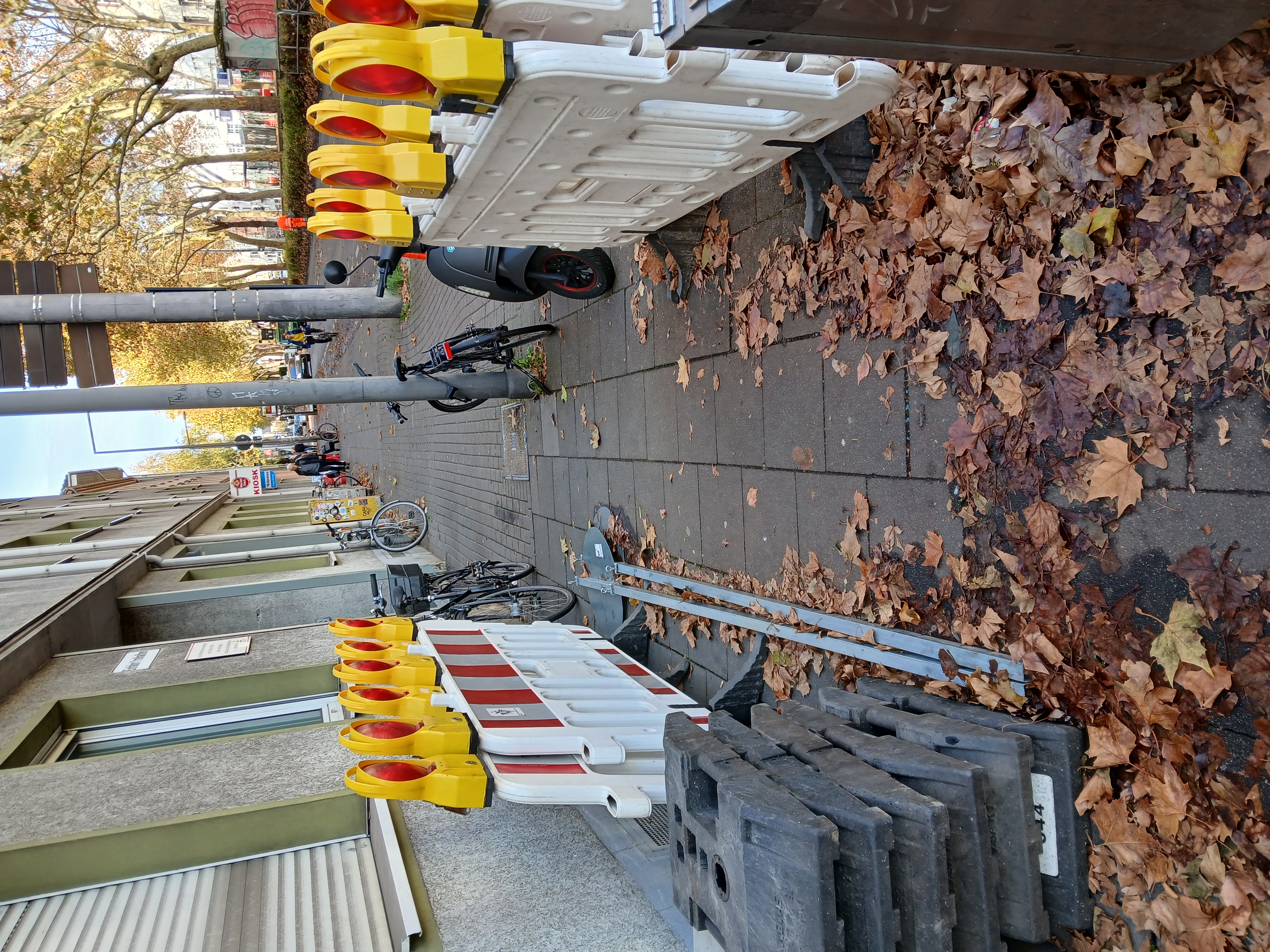 Auf dem Gehweg stehen Absperrungen, wohl vom KölnMarathon übrig geblieben