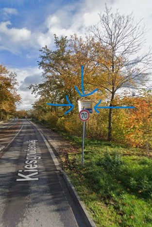 Aus Köln-Immendorf kommend verlässt man den Kreisverkehr an der 2-ten Ausfahrt auf den Kiesgrubenweg. Auf der rechten Seite steht nur noch die Halterung des Verkehrsschildes.