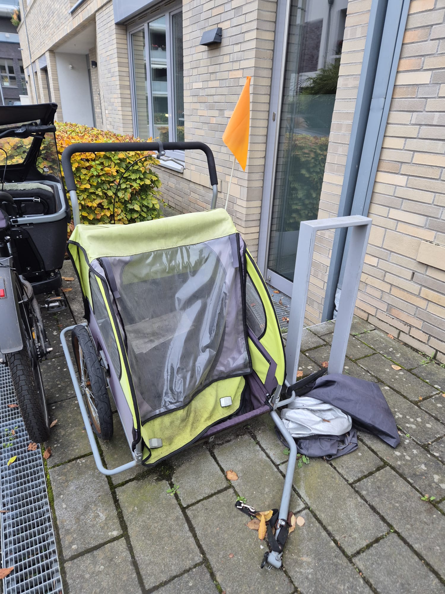Dieser grüne Fahrradanhänger steht schon seit fast einem Jahr dort.
