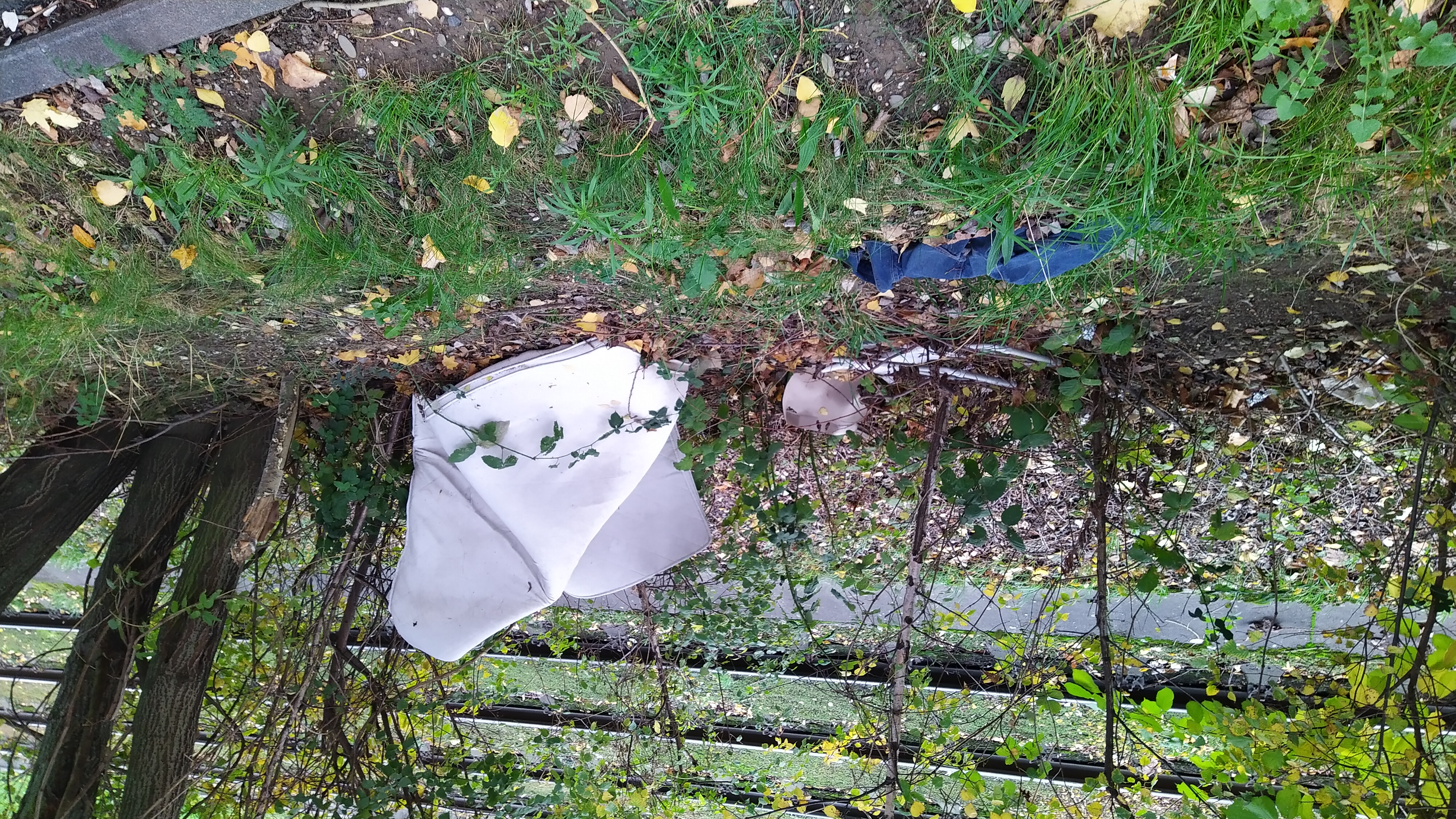 Es ist Herbst geworden um die Matratze am Sraßenbahndamm... Und sie hat Zuwachs bekommen von Alttextilien und Plastikteilen.