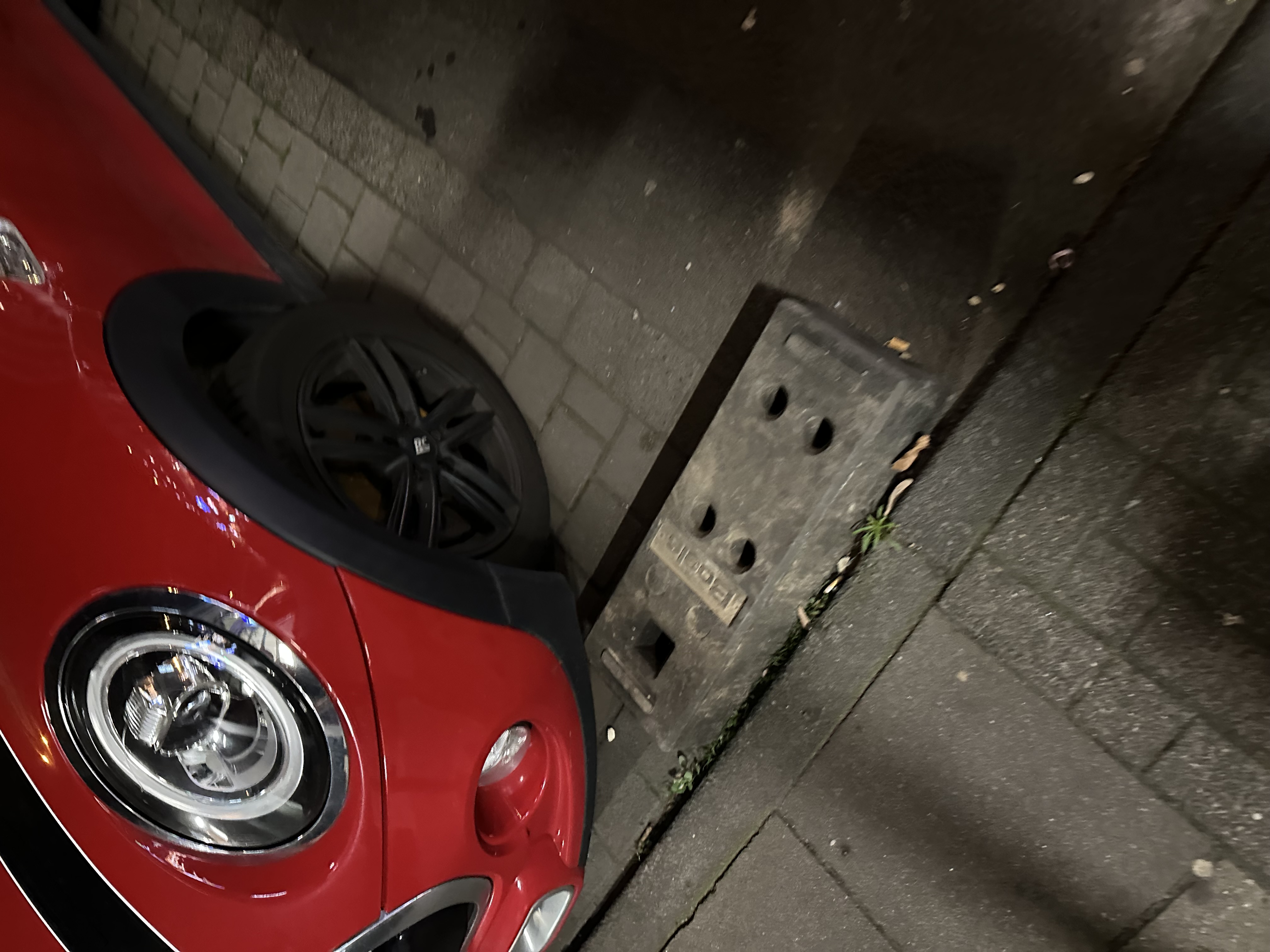 Neben der Tiefgaragen Einfahrt zwischen den parkenden Autos als Stolperfalle ein vergessener Beschwerungssstein für Baustellenschilder