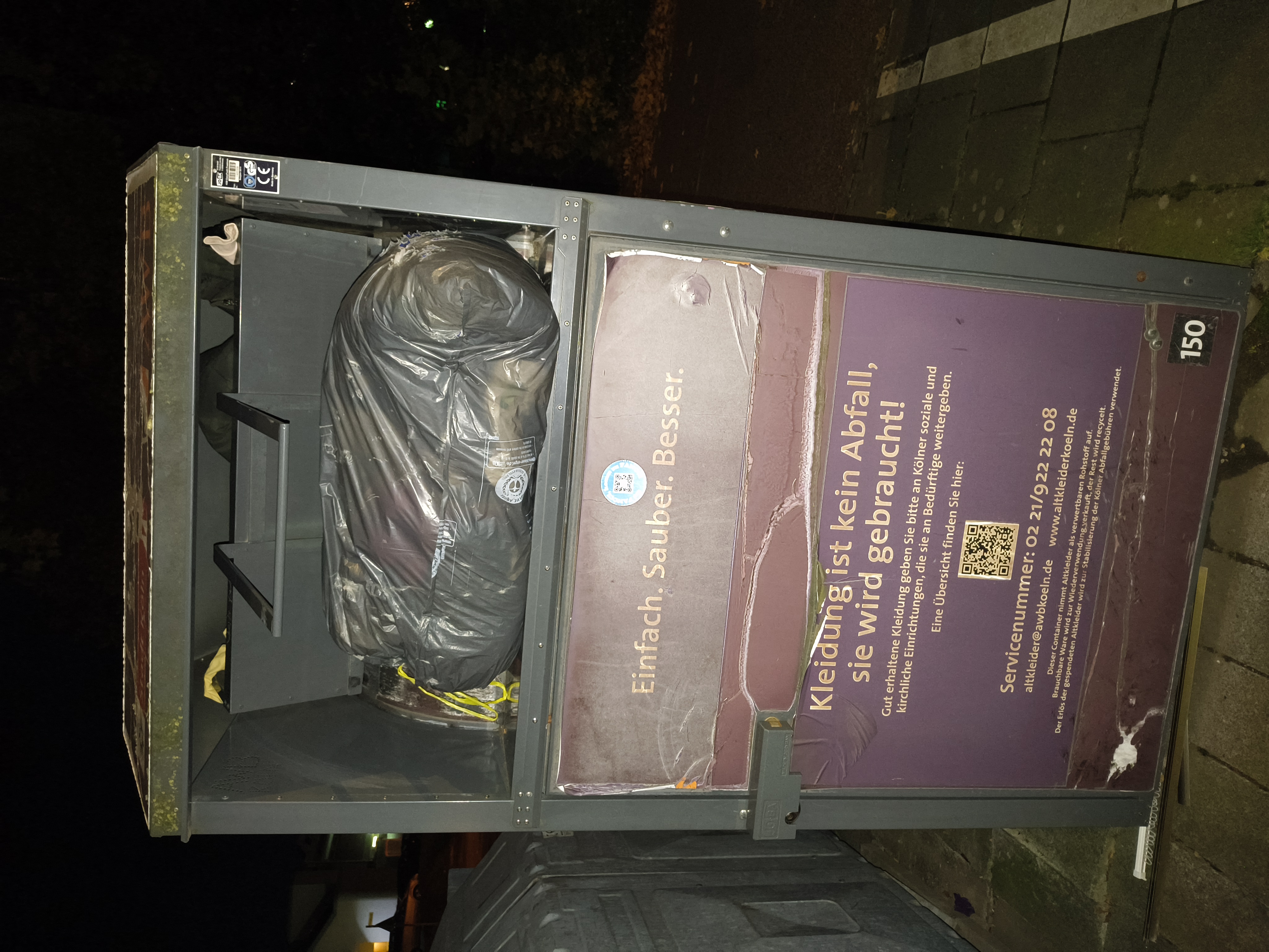 Der volle Kleidercontainer wurde bereits gemeldet, aber immer noch nicht geleert. Es wurden lediglich die Sachen, die davor gestanden haben, abgeholt. Mittlerweile liegt erneut ein Sack mit Kleidungsstücken vor der Klappe.
