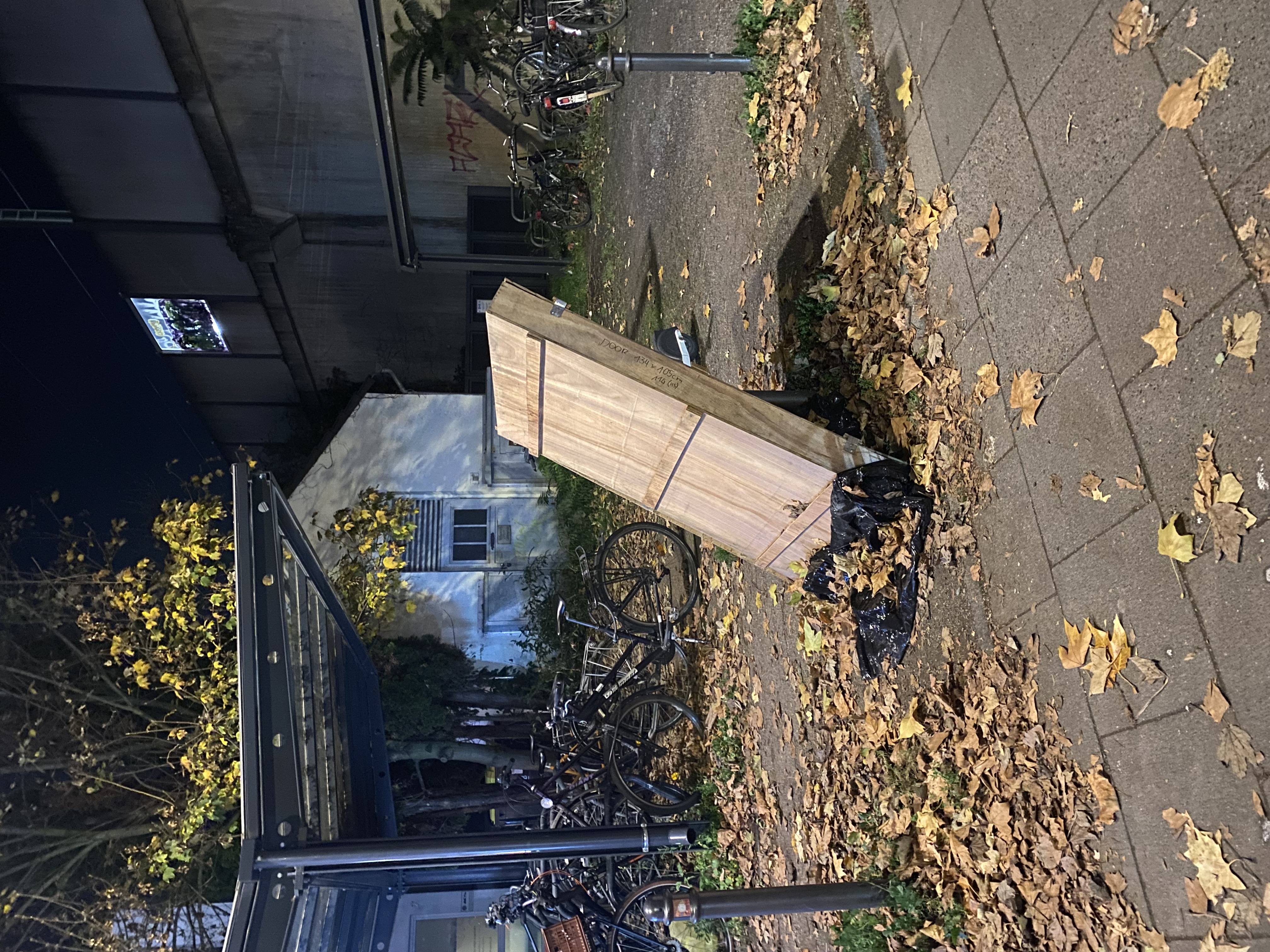 Holzelement (H100cm x B100cm x T15cm), das zwischen Gehweg und Fahrradständern abgestellt wurde.