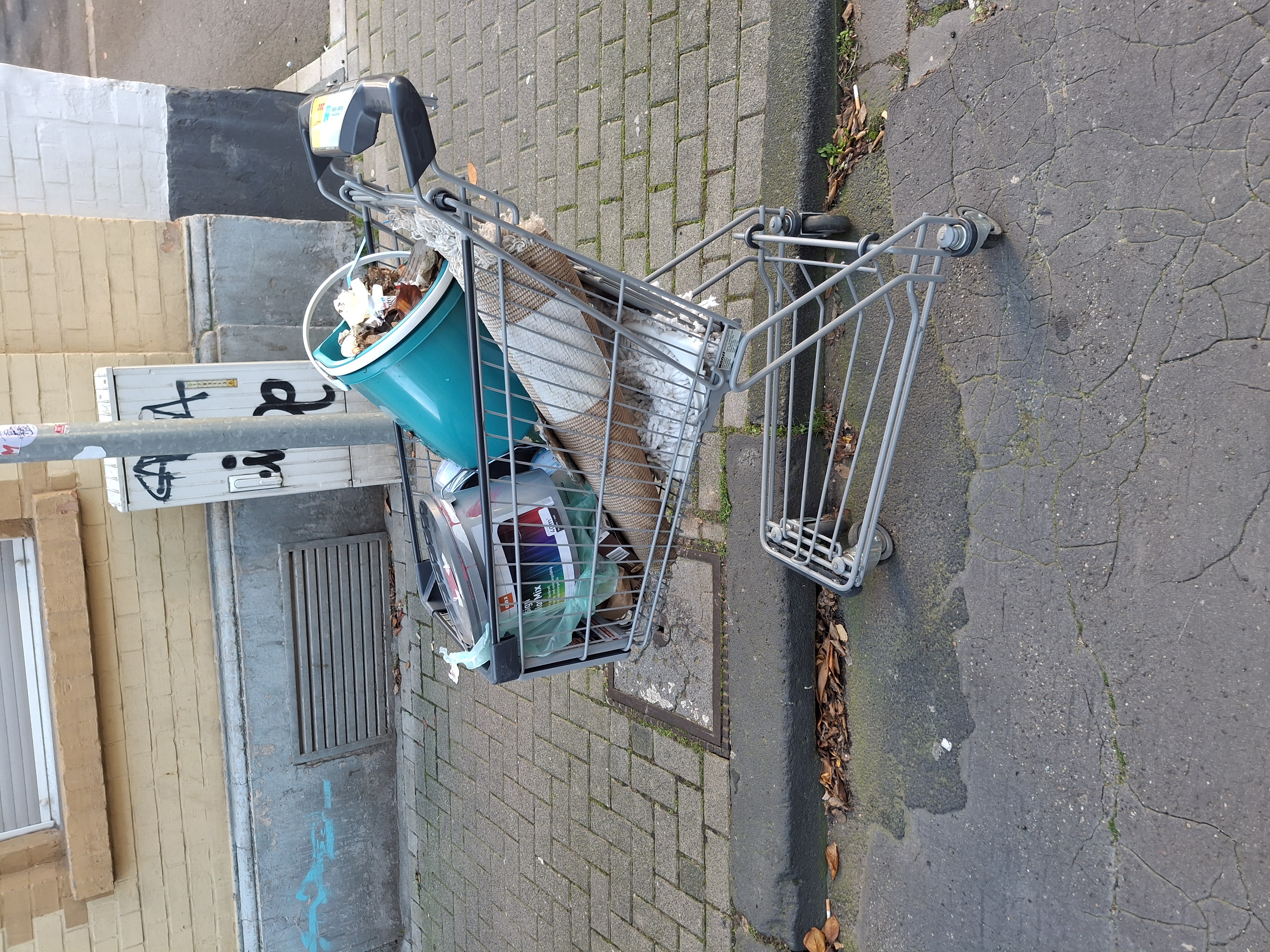 Ein Nettoeinkaufswagen voller Müll wurde vor dem Haß Gartenstr.9, 50733 Köln abgestellt.