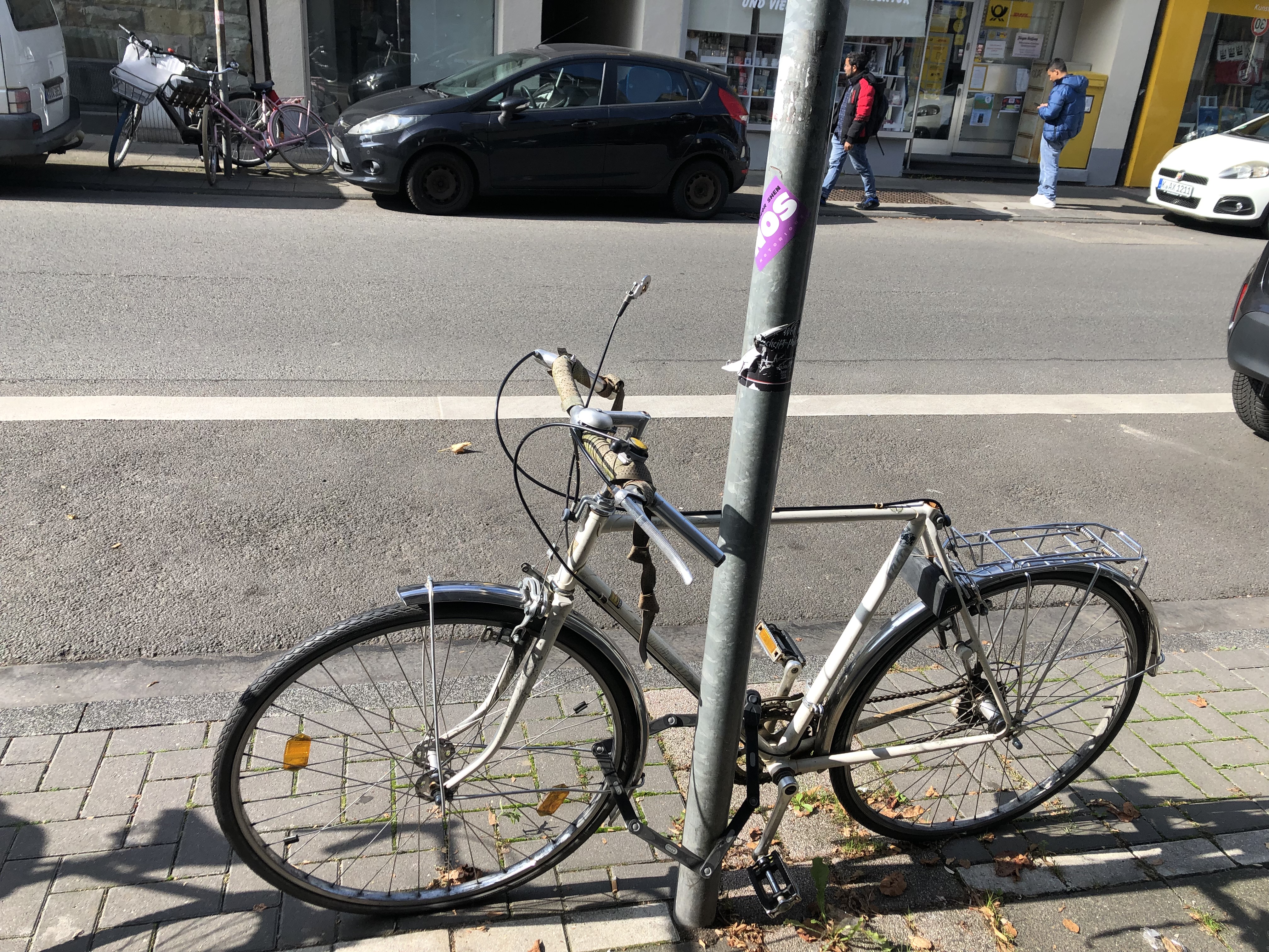das Rad steht seit Juni unverändert und sattellos vor unserer Haustür.