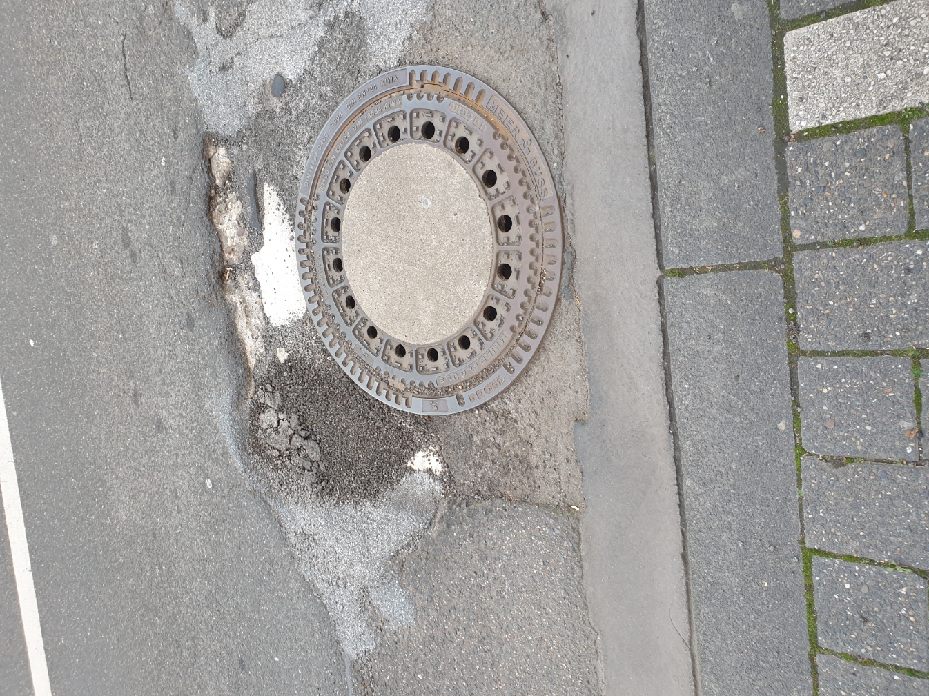 Vor dem Haus Victoriastraße 24 am Gulli-Deckel sind Schäden im Asphalt bis runter auf die inzwischen sichtbare Betondecke.