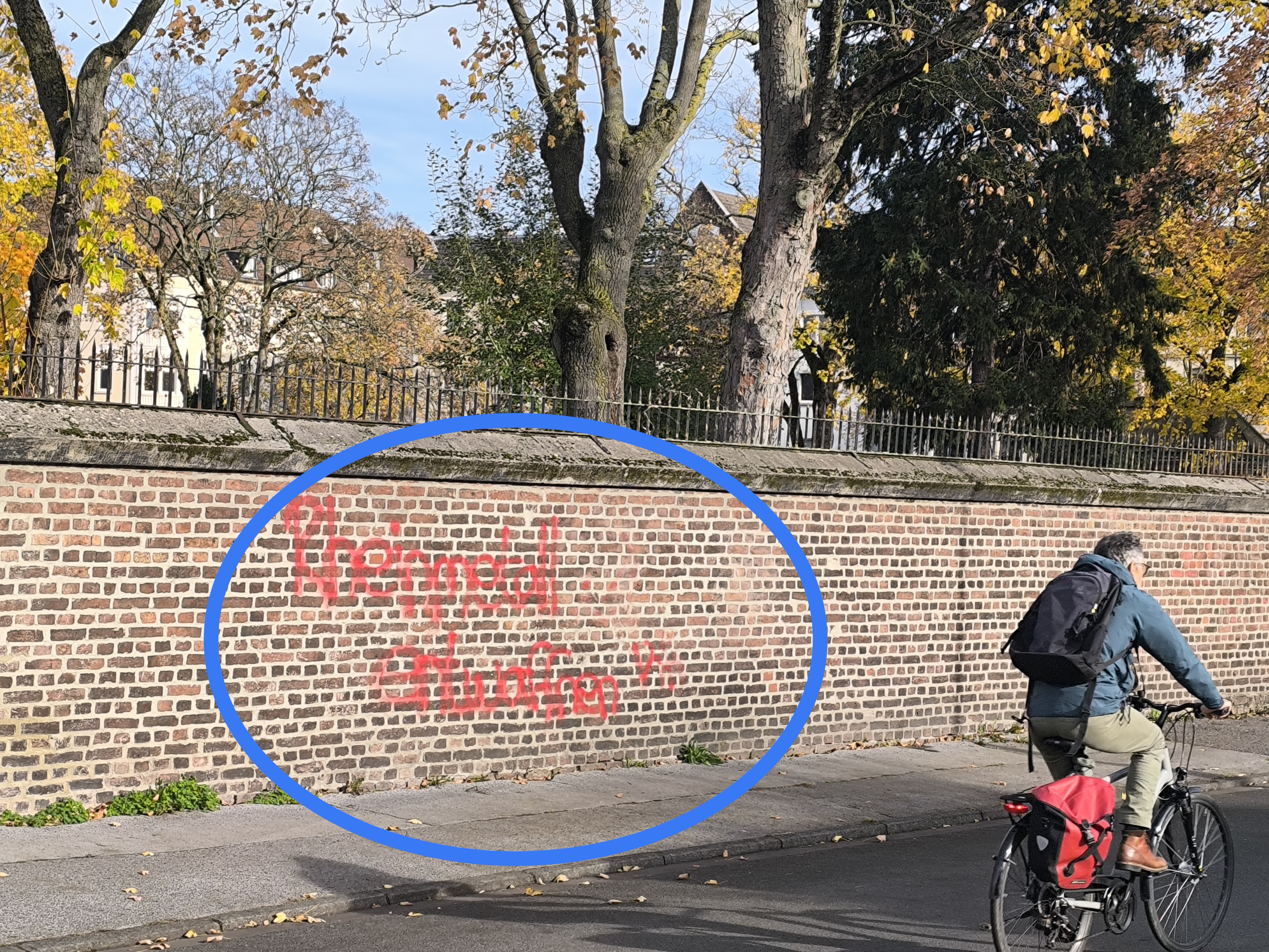 Die Beseitigung der von Ihnen gemeldeten Schmiererei an öffentlichem Eigentum ist von der Kölner Anti-Spray-Aktion (KASA) fest beauftragt und die Sachbeschädigung bei der Kriminalpolizei angezeigt.