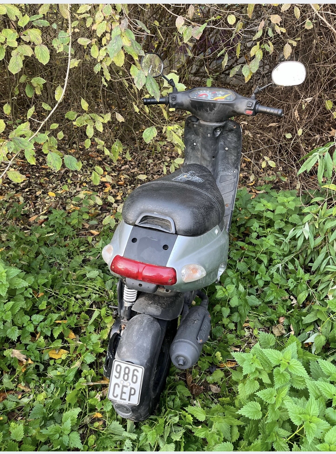Defekter Roller mit abgelaufenem Versicherungskennzeichen steht im dortigen Gebüsch vom Park aus zugänglich