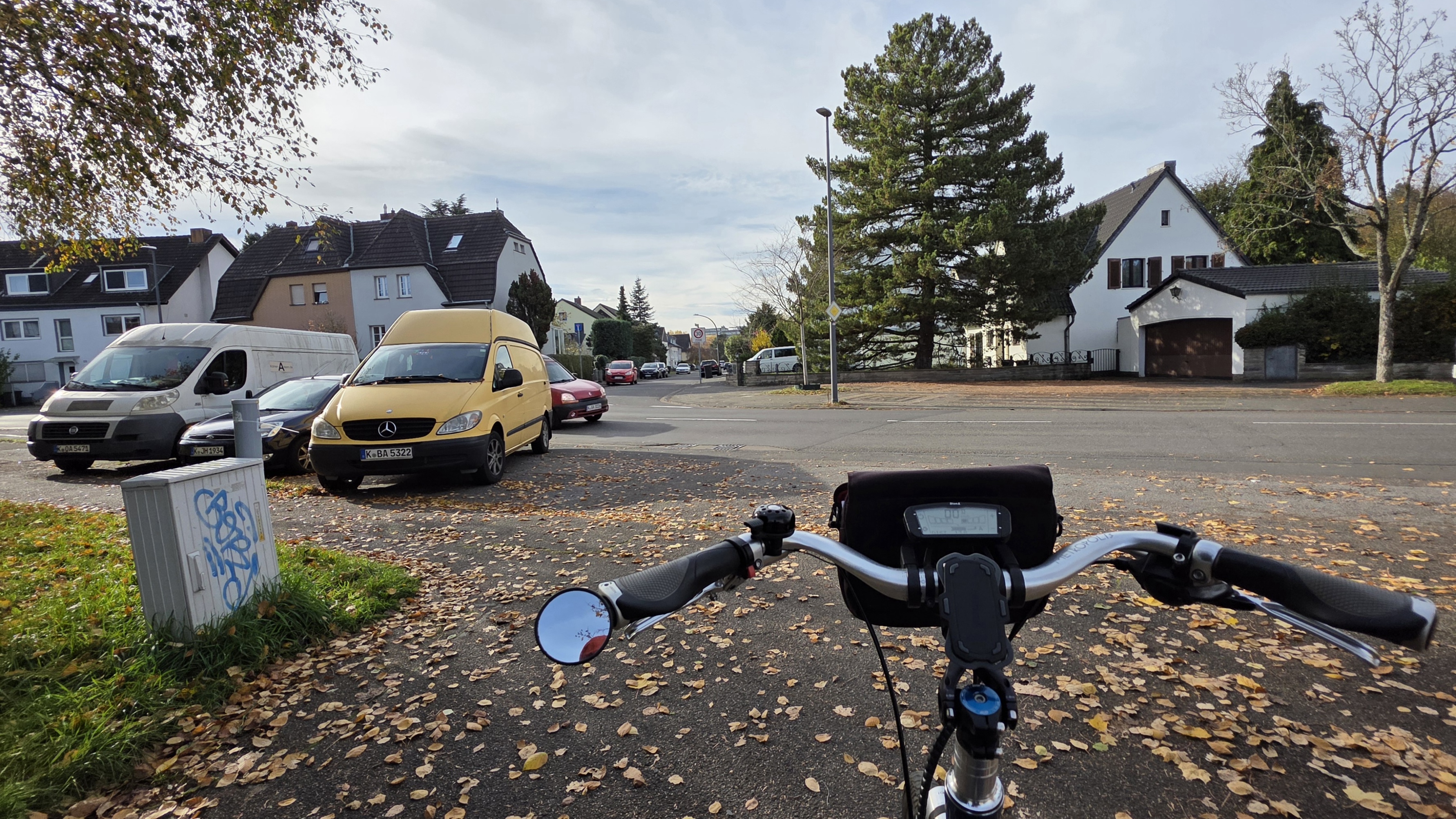 Sichtbehindernde Schrägparkplätze im Einmündungsbereich des kombinierten Geh/Radwegs in einer Kurve des Dellbrücker Mauspfads in Höhe Haus-Nr. 188. Sperrmarkierung oder Abgrenzung zur Freihaltung der Sichtbeziehungen erforderlich, da der Weg auch von Schülern der angrenzenden Schule genutzt wird.