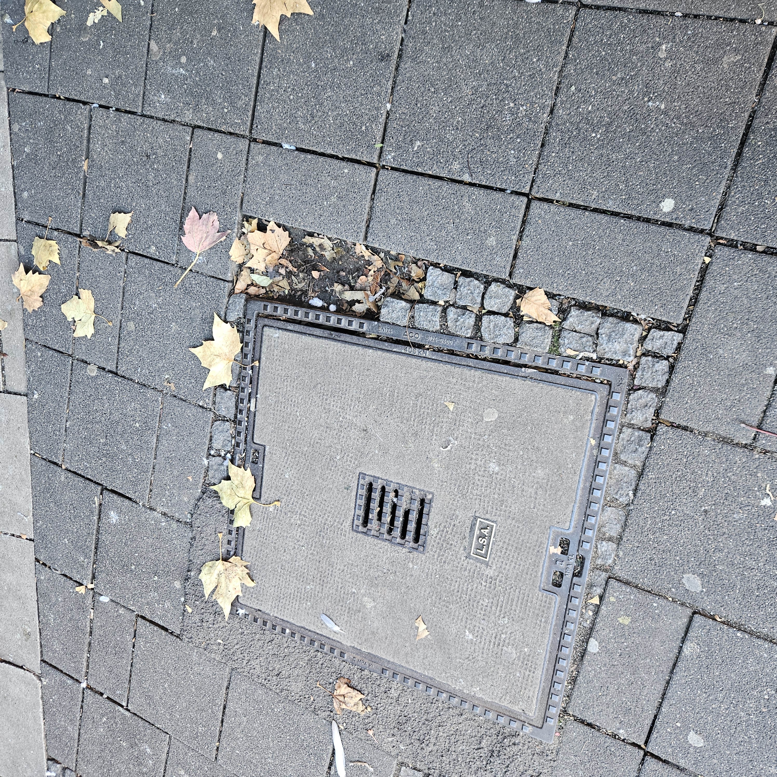 Fehlende Pflastersteine neben einem Versorgungsschacht.