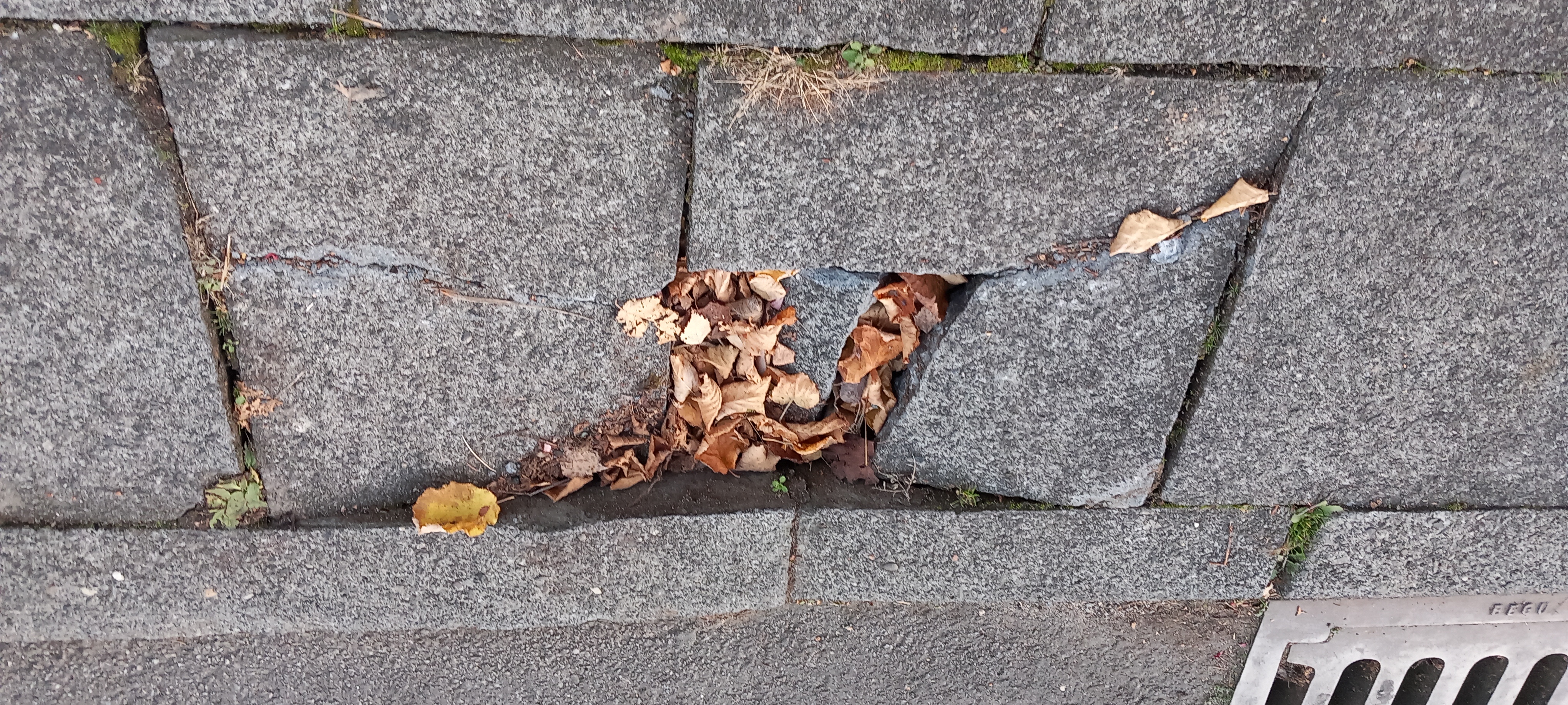 Diese Gehwegstelle befindet sich vor Haus Brunsbütteler Str 1, 50737Köln. Der Untergrund ist weggespült, daher versinken die Platten und werden, da in einer Kurve liegend, von Fahrzeugen zerstört.