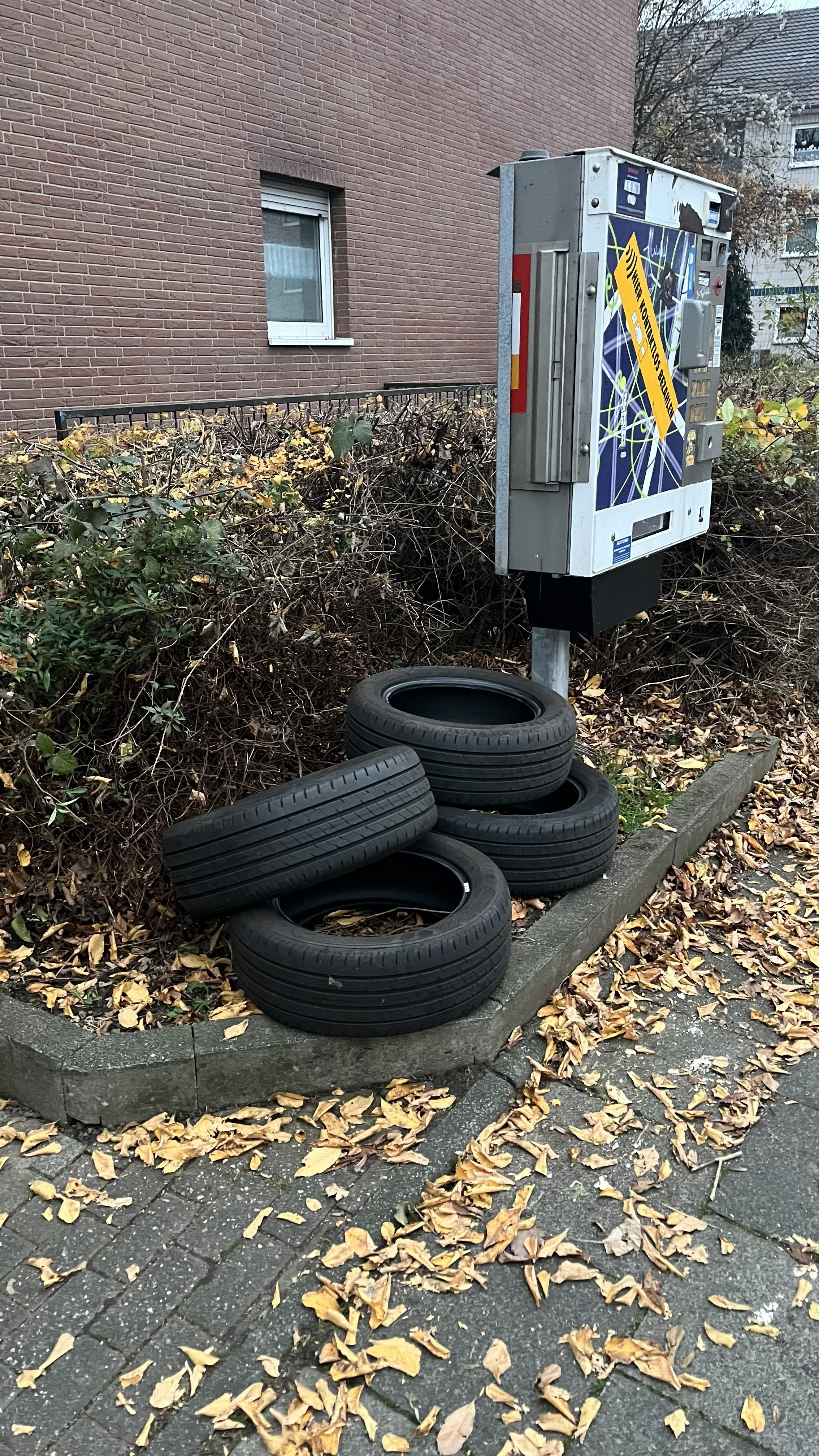 Diese vier Reifen wurden am 08.11.2025 offensichtlich nach Wechsel abgelegt. Wahrscheinlich war dem (vermutlichen) Besitzer die Entsorgung dann doch zu teuer.