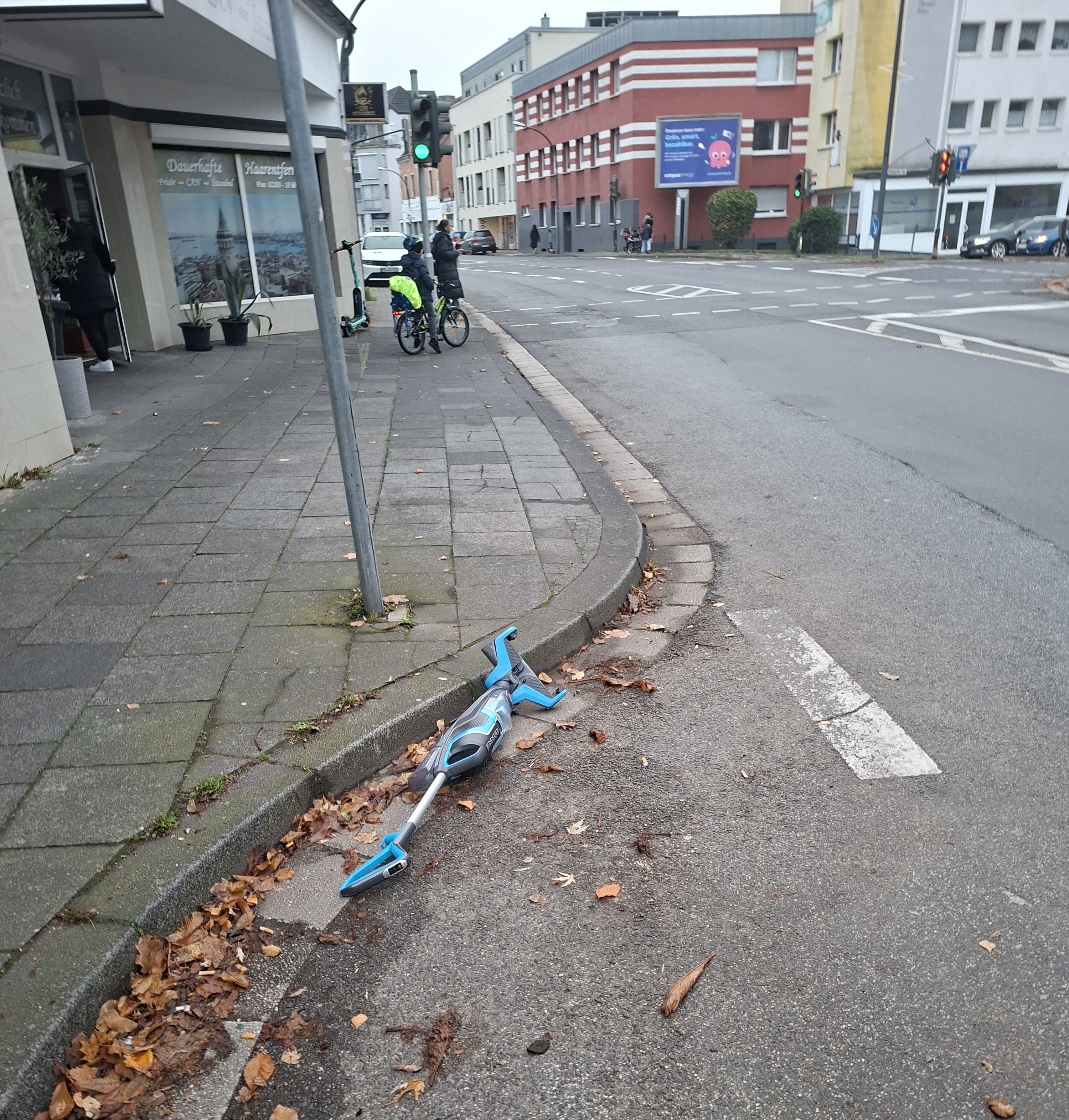 Es liegt ein Akku Staubsauger auf dem Parkplatz.