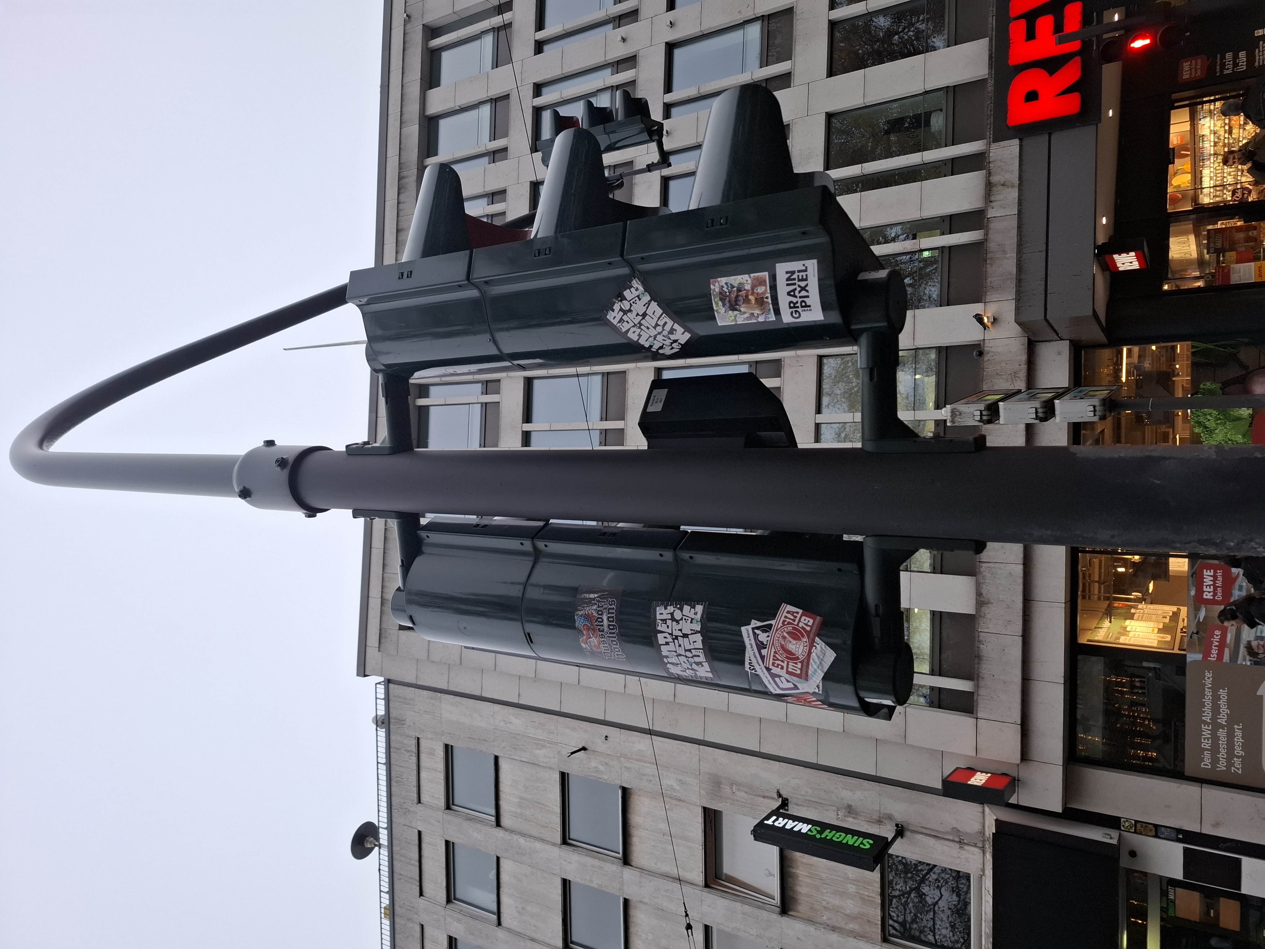 Vollgestickerte Fußgängerampel, bitte reinigen. Bitte auch die nebenstehenden Poller beachten.