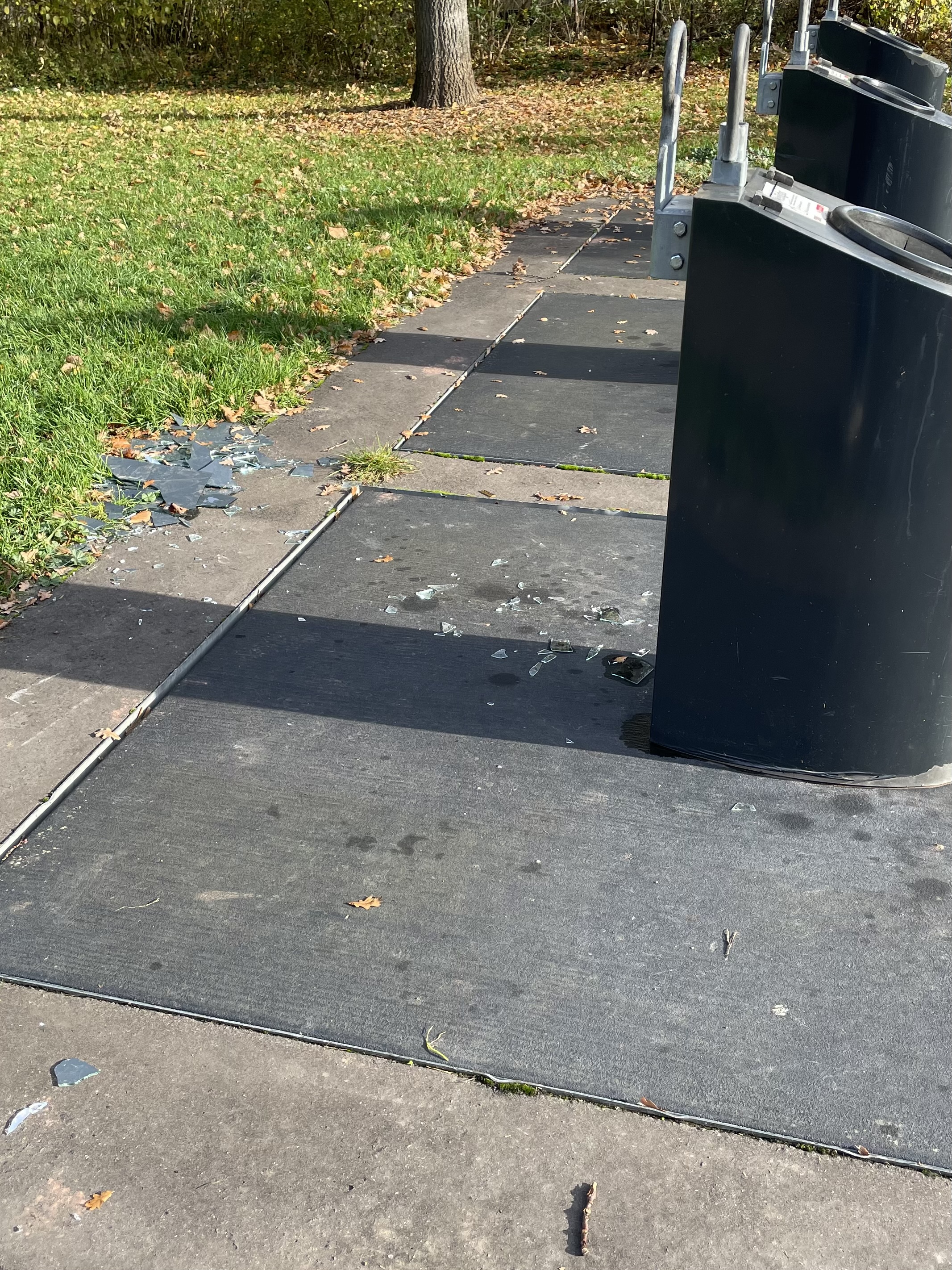 Alles voller Scherben rund um die Glascontainer. Sehr gefährlich.